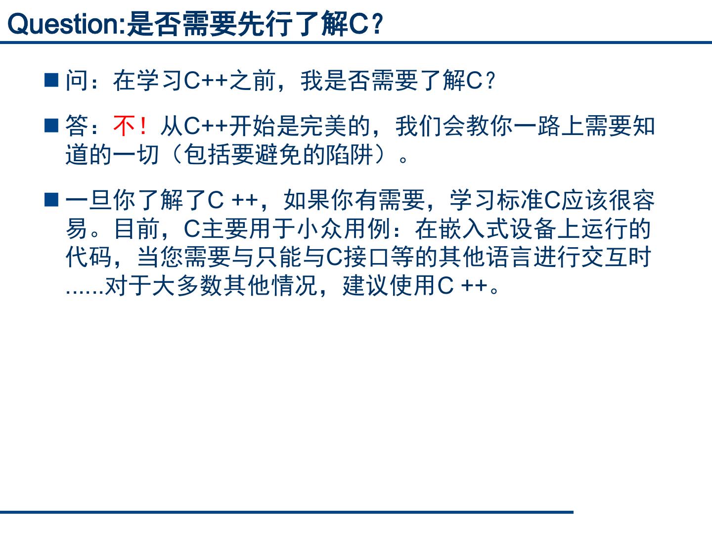17 .Question:是否需要先行了解C? 问:在学习C++之前,我是否需要了解C? 答:不!从C++开始是完美的,我们会教你一路上需要知 道的一切(包括要避免的陷阱)。 一旦你了解了C ++,如果你有需要,学习标准C应该很容 易。目前,C主要用于小众用例:在嵌入式设备上运行的 代码,当您需要与只能与C接口等的其他语言进行交互时 ......对于大多数其他情况,建议使用C ++。