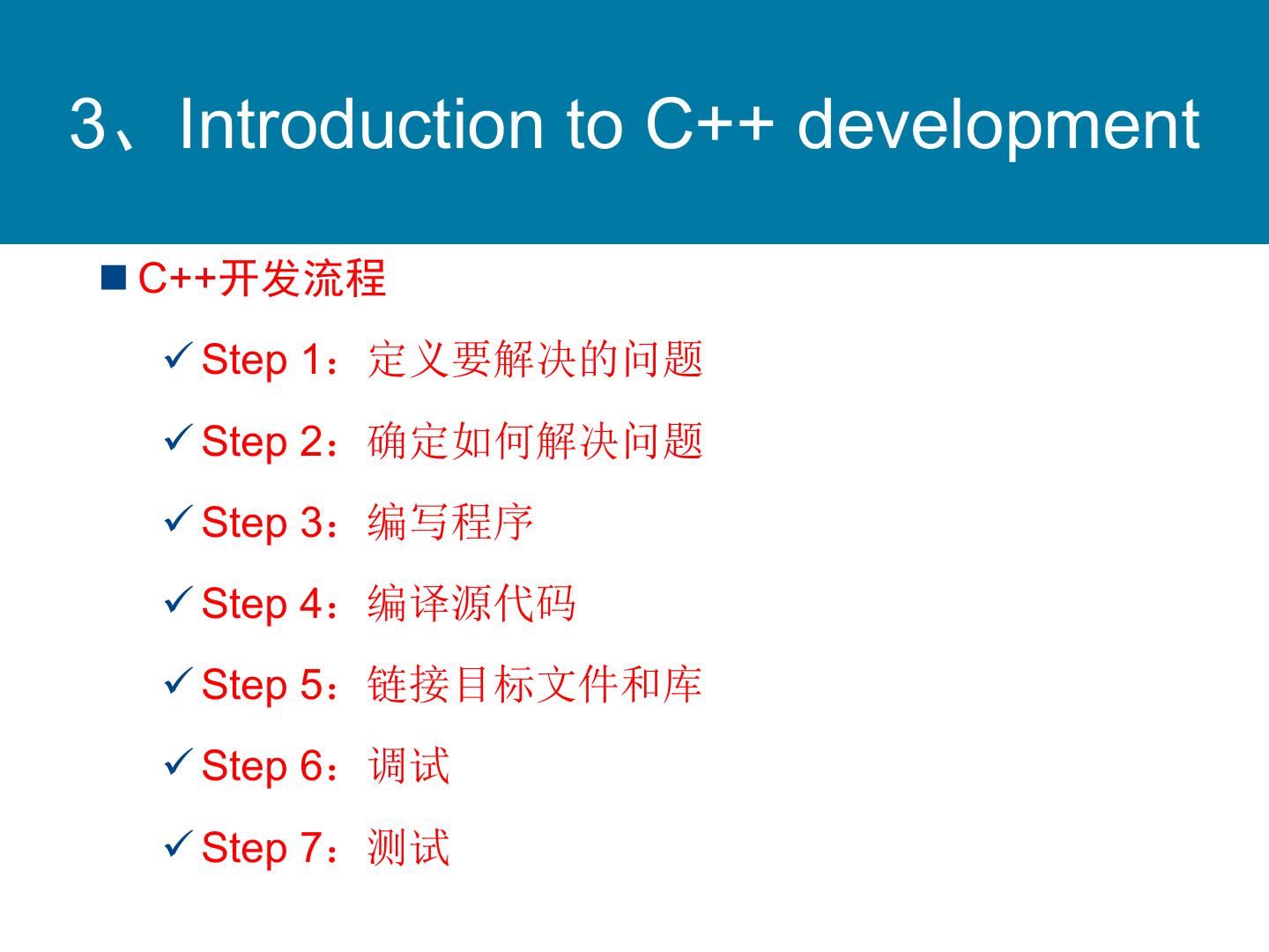 18 .3、Introduction to C++ development C++开发流程 Step 1:定义要解决的问题 Step 2:确定如何解决问题 Step 3:编写程序 Step 4:编译源代码 Step 5:链接目标文件和库 Step 6:调试 Step 7:测试