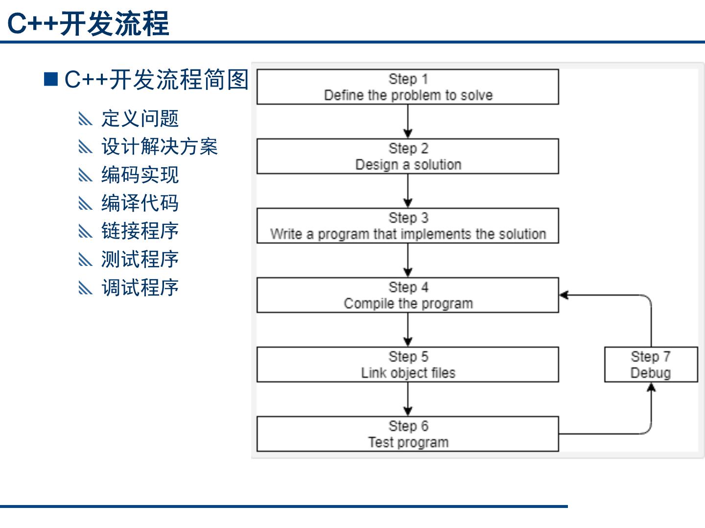 19 .C++开发流程 C++开发流程简图 定义问题 设计解决方案 编码实现 编译代码 链接程序 测试程序 调试程序