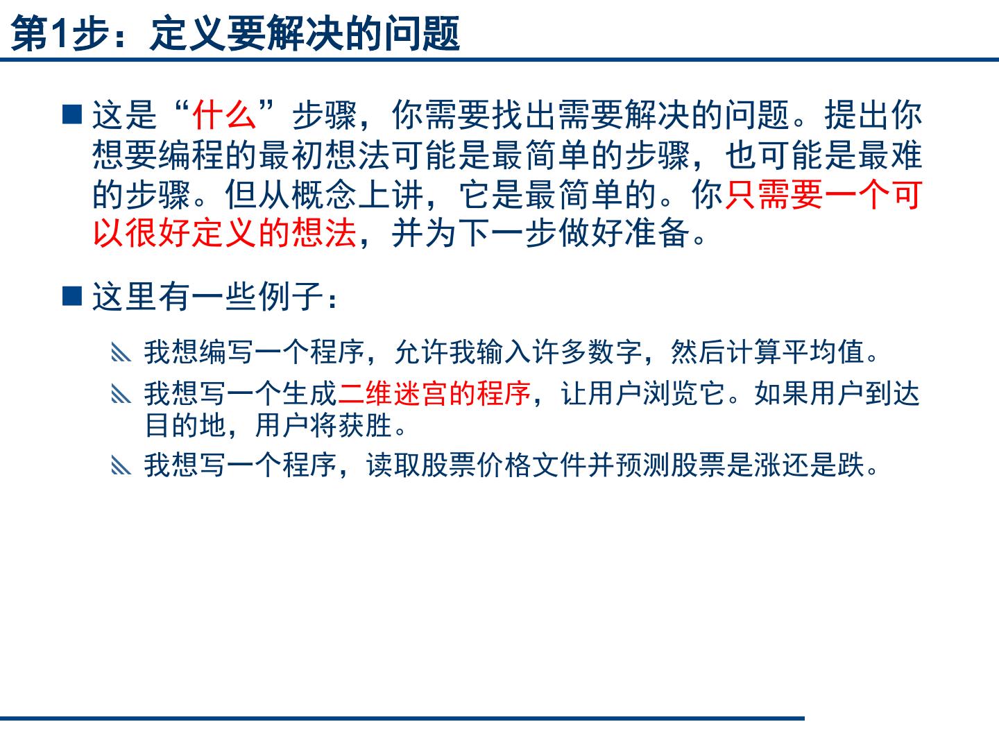 20 .第1步:定义要解决的问题 这是“什么”步骤,你需要找出需要解决的问题。提出你 想要编程的最初想法可能是最简单的步骤,也可能是最难 的步骤。但从概念上讲,它是最简单的。你只需要一个可 以很好定义的想法,并为下一步做好准备。 这里有一些例子: 我想编写一个程序,允许我输入许多数字,然后计算平均值。 我想写一个生成二维迷宫的程序,让用户浏览它。如果用户到达 目的地,用户将获胜。 我想写一个程序,读取股票价格文件并预测股票是涨还是跌。