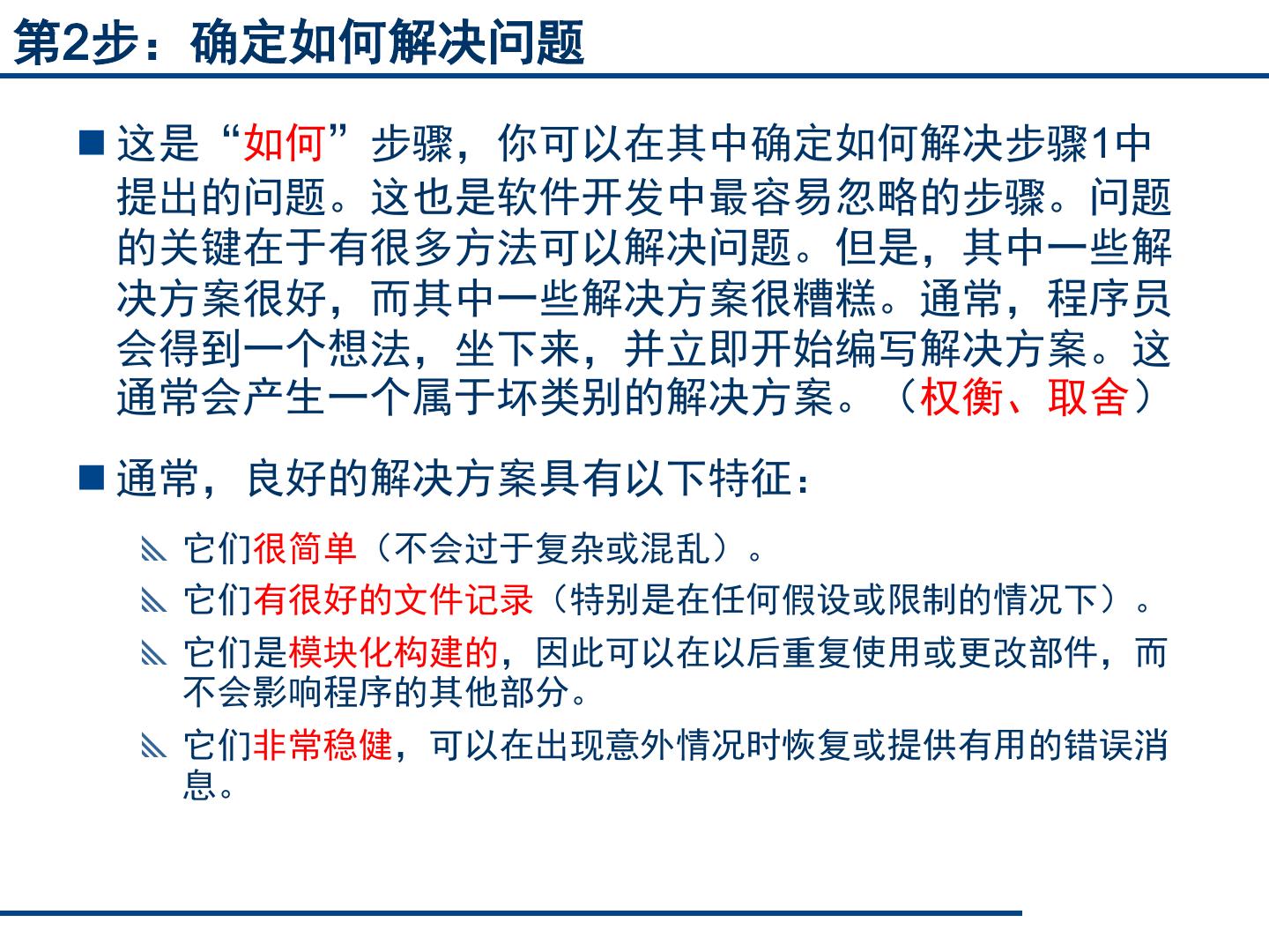 21 .第2步:确定如何解决问题 这是“如何”步骤,你可以在其中确定如何解决步骤1中 提出的问题。这也是软件开发中最容易忽略的步骤。问题 的关键在于有很多方法可以解决问题。但是,其中一些解 决方案很好,而其中一些解决方案很糟糕。通常,程序员 会得到一个想法,坐下来,并立即开始编写解决方案。这 通常会产生一个属于坏类别的解决方案。(权衡、取舍) 通常,良好的解决方案具有以下特征: 它们很简单(不会过于复杂或混乱)。 它们有很好的文件记录(特别是在任何假设或限制的情况下)。 它们是模块化构建的,因此可以在以后重复使用或更改部件,而 不会影响程序的其他部分。 它们非常稳健,可以在出现意外情况时恢复或提供有用的错误消 息。