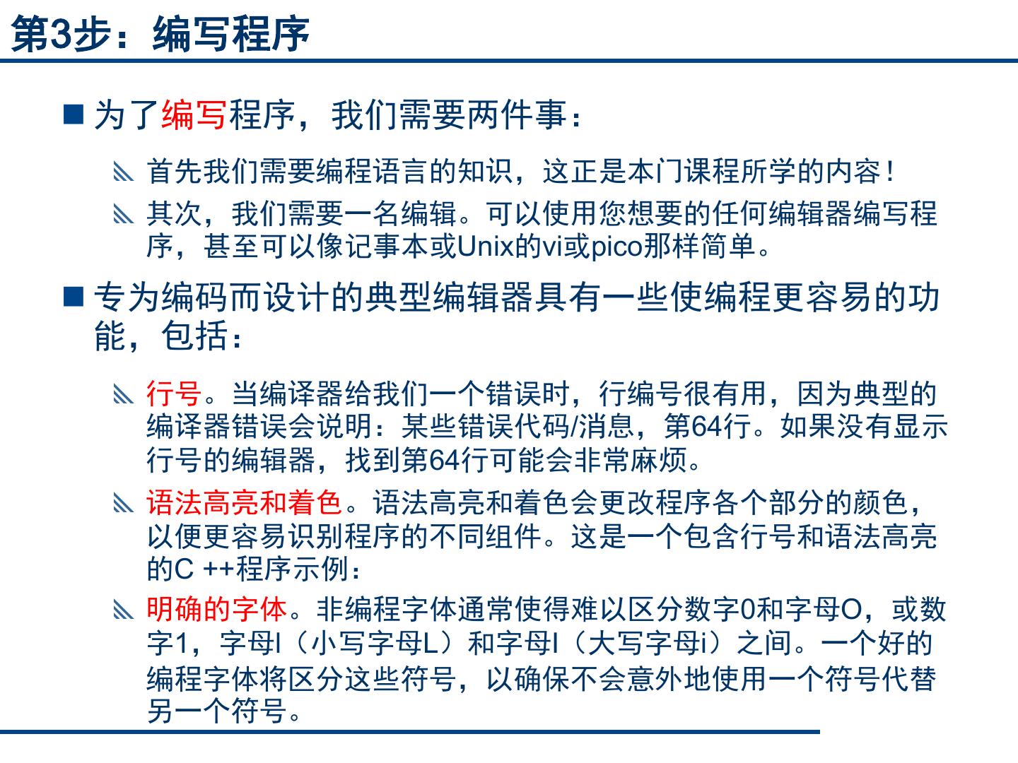 22 .第3步:编写程序 为了编写程序,我们需要两件事: 首先我们需要编程语言的知识,这正是本门课程所学的内容! 其次,我们需要一名编辑。可以使用您想要的任何编辑器编写程 序,甚至可以像记事本或Unix的vi或pico那样简单。 专为编码而设计的典型编辑器具有一些使编程更容易的功 能,包括: 行号。当编译器给我们一个错误时,行编号很有用,因为典型的 编译器错误会说明:某些错误代码/消息,第64行。如果没有显示 行号的编辑器,找到第64行可能会非常麻烦。 语法高亮和着色。语法高亮和着色会更改程序各个部分的颜色, 以便更容易识别程序的不同组件。这是一个包含行号和语法高亮 的C ++程序示例: 明确的字体。非编程字体通常使得难以区分数字0和字母O,或数 字1,字母l(小写字母L)和字母I(大写字母i)之间。一个好的 编程字体将区分这些符号,以确保不会意外地使用一个符号代替 另一个符号。