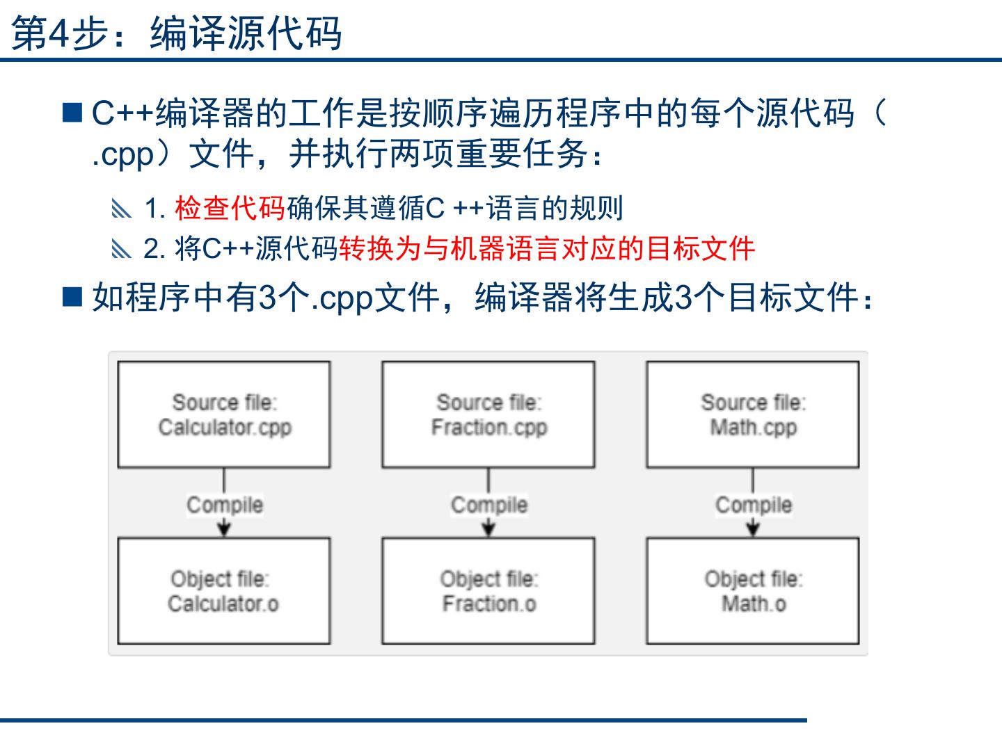 23 .第4步:编译源代码 C++编译器的工作是按顺序遍历程序中的每个源代码( .cpp)文件,并执行两项重要任务: 1. 检查代码确保其遵循C ++语言的规则 2. 将C++源代码转换为与机器语言对应的目标文件 如程序中有3个.cpp文件,编译器将生成3个目标文件: