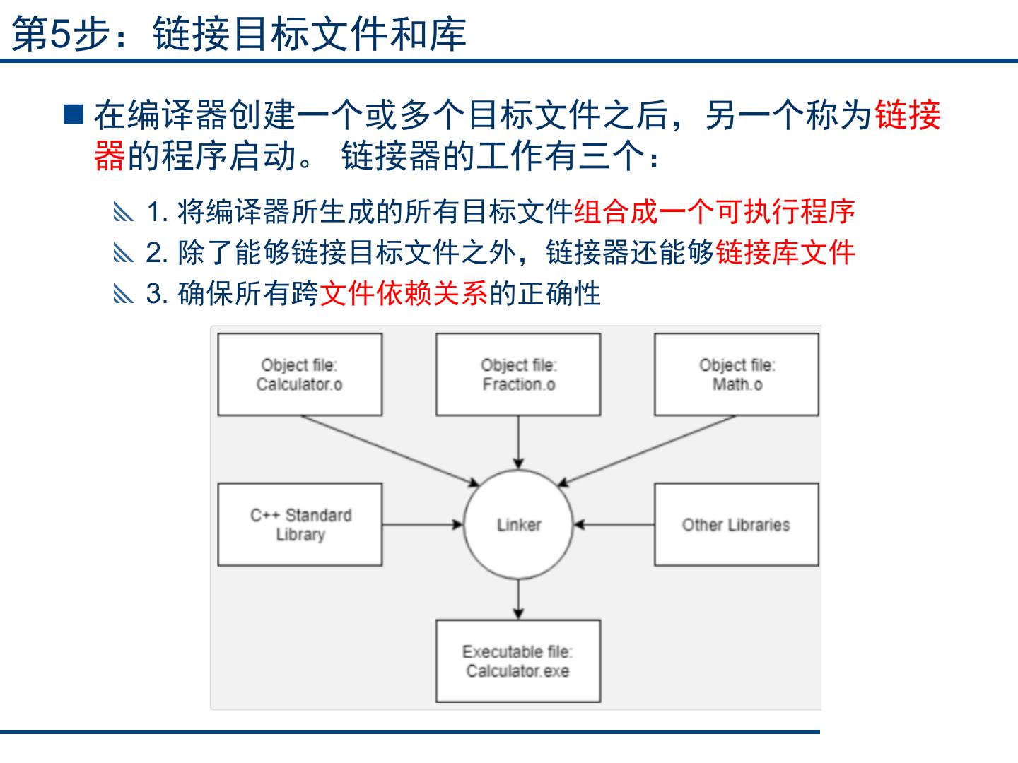 24 .第5步:链接目标文件和库 在编译器创建一个或多个目标文件之后,另一个称为链接 器的程序启动。 链接器的工作有三个: 1. 将编译器所生成的所有目标文件组合成一个可执行程序 2. 除了能够链接目标文件之外,链接器还能够链接库文件 3. 确保所有跨文件依赖关系的正确性