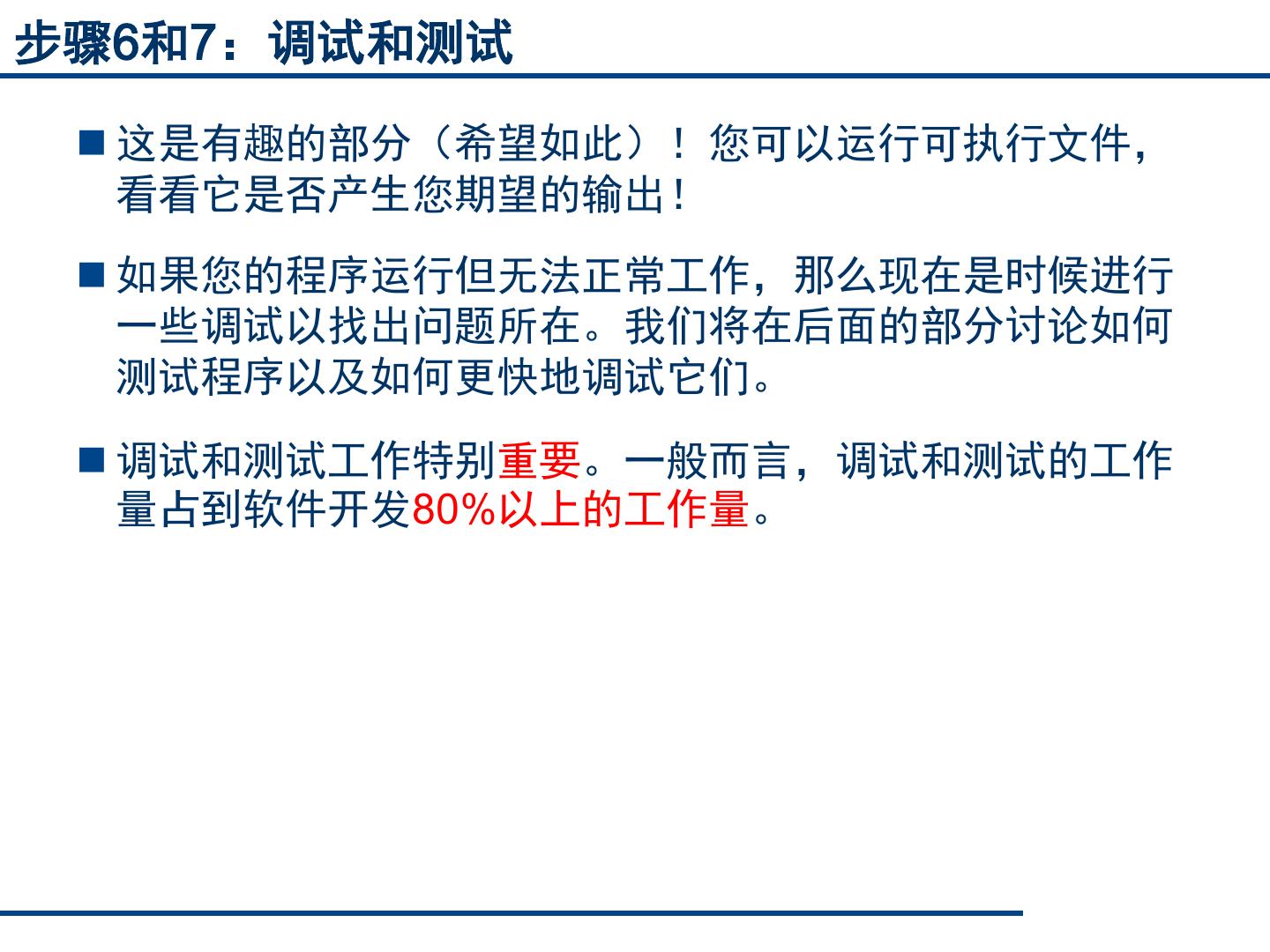 25 .步骤6和7:调试和测试 这是有趣的部分(希望如此)!您可以运行可执行文件, 看看它是否产生您期望的输出! 如果您的程序运行但无法正常工作,那么现在是时候进行 一些调试以找出问题所在。我们将在后面的部分讨论如何 测试程序以及如何更快地调试它们。 调试和测试工作特别重要。一般而言,调试和测试的工作 量占到软件开发80%以上的工作量。