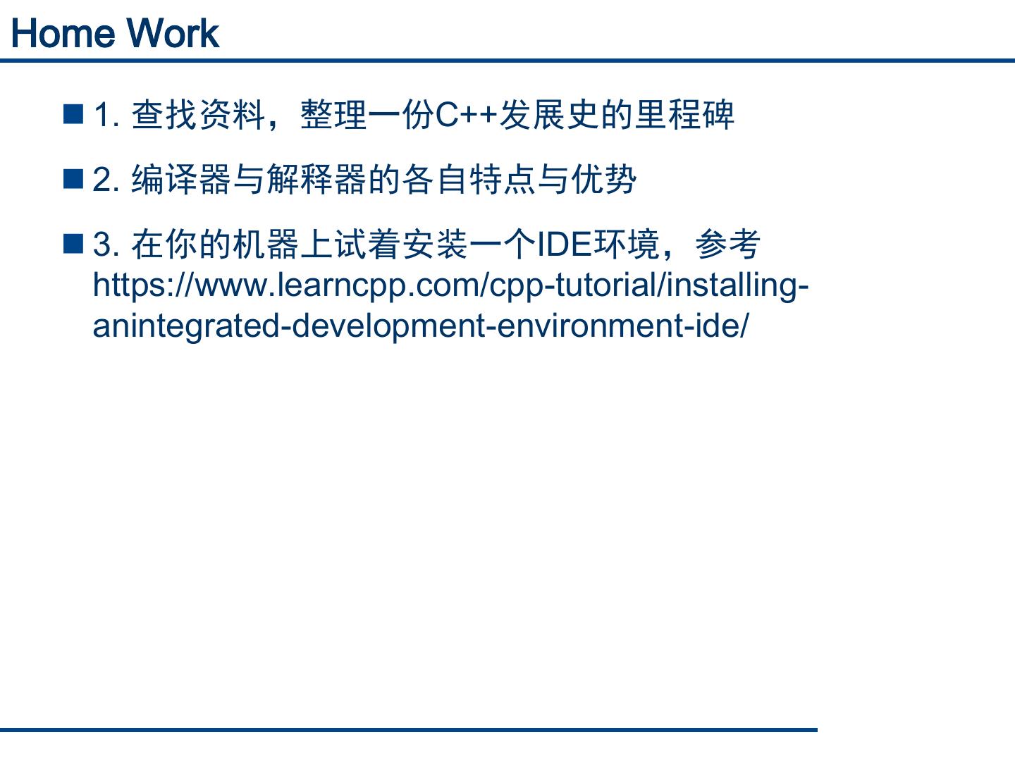 26 .Home Work 1. 查找资料,整理一份C++发展史的里程碑 2. 编译器与解释器的各自特点与优势 3. 在你的机器上试着安装一个IDE环境,参考 https://www.learncpp.com/cpp-tutorial/installing- anintegrated-development-environment-ide/