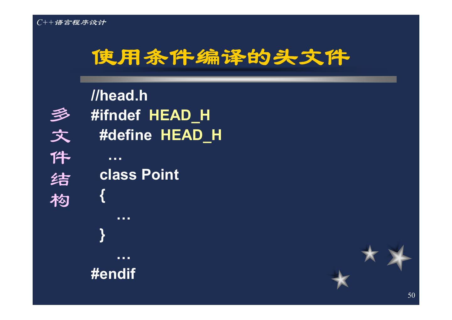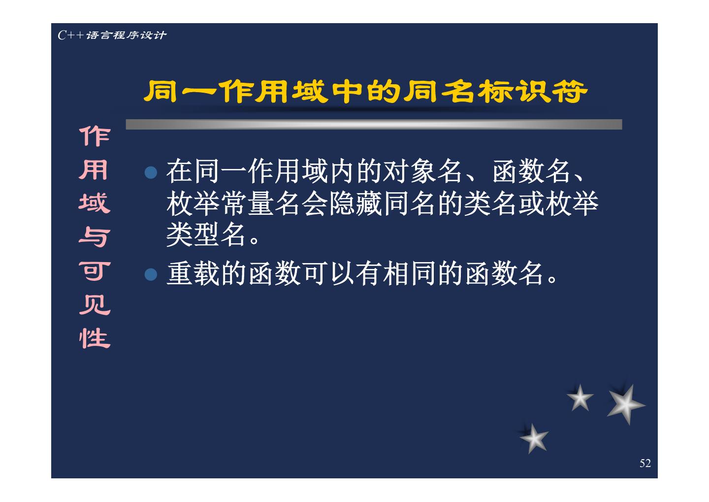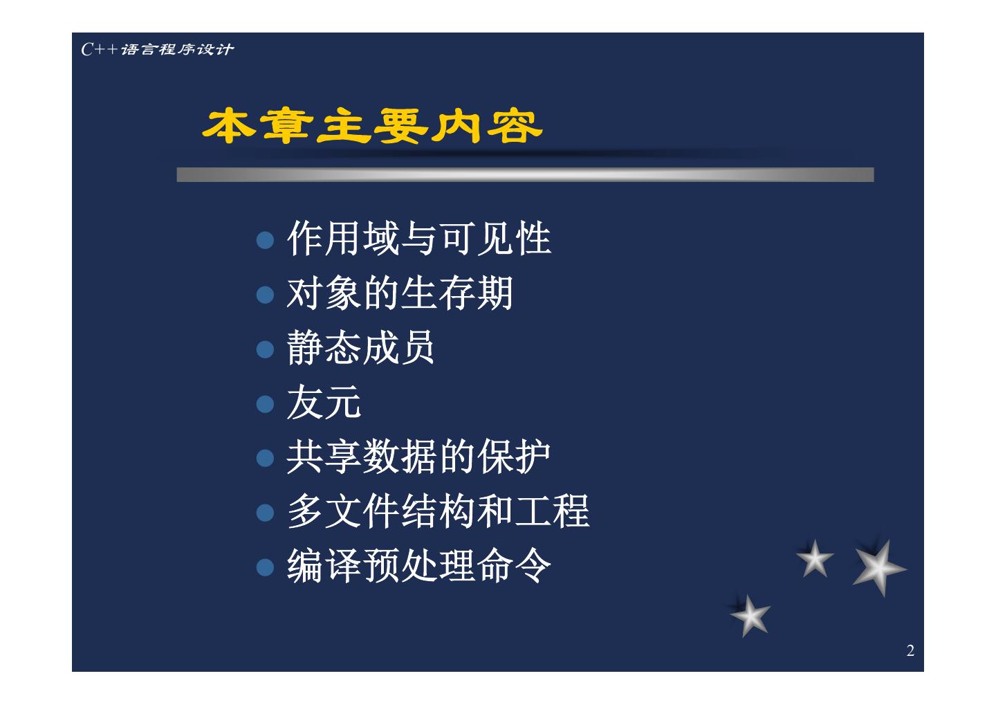 2 .C++语言程序设计 本章主要内容 作用域与可见性 对象的生存期 静态成员 友元 共享数据的保护 多文件结构和工程 编译预处理命令 2