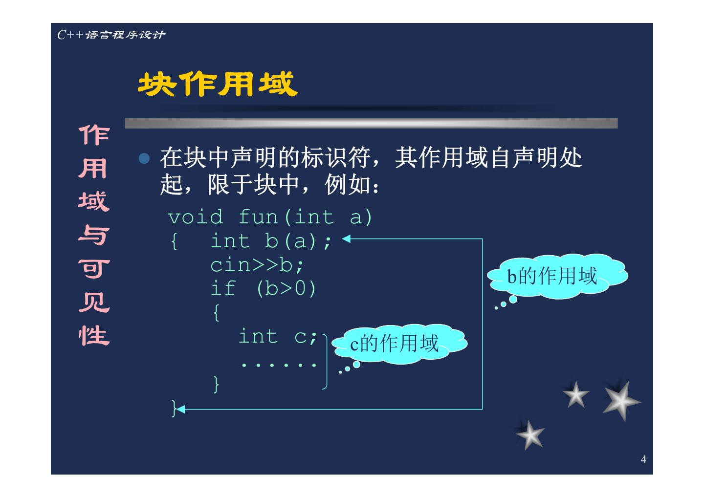 4 .C++语言程序设计 作用域与可见性 块作用域 在块中声明的标识符,其作用域自声明处 起,限于块中,例如: void fun(int a) { int b(a); cin>>b; b的作用域 if (b>0) { int c; c的作用域 ...... } } 4
