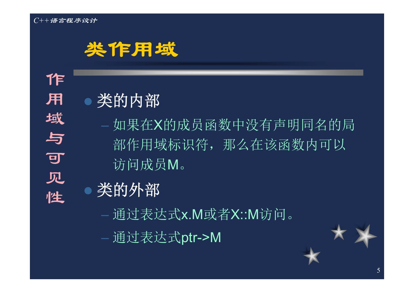 5 .C++语言程序设计 作用域与可见性 类作用域 类的内部 – 如果在X的成员函数中没有声明同名的局 部作用域标识符,那么在该函数内可以 访问成员M。 类的外部 – 通过表达式x.M或者X::M访问。 – 通过表达式ptr->M 5