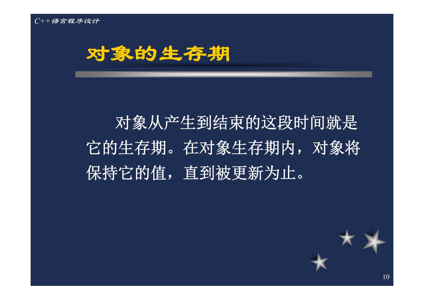 10 .C++语言程序设计 对象的生存期 对象从产生到结束的这段时间就是 它的生存期。在对象生存期内,对象将 保持它的值,直到被更新为止。 10