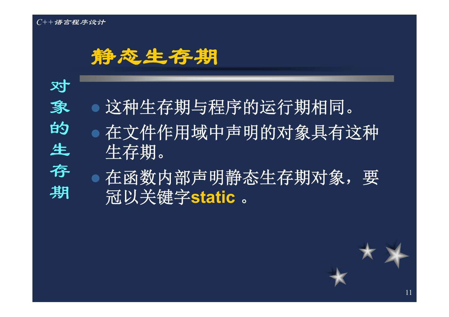 11 .C++语言程序设计 对象的生存期 静态生存期 这种生存期与程序的运行期相同。 在文件作用域中声明的对象具有这种 生存期。 在函数内部声明静态生存期对象,要 冠以关键字static 。 11