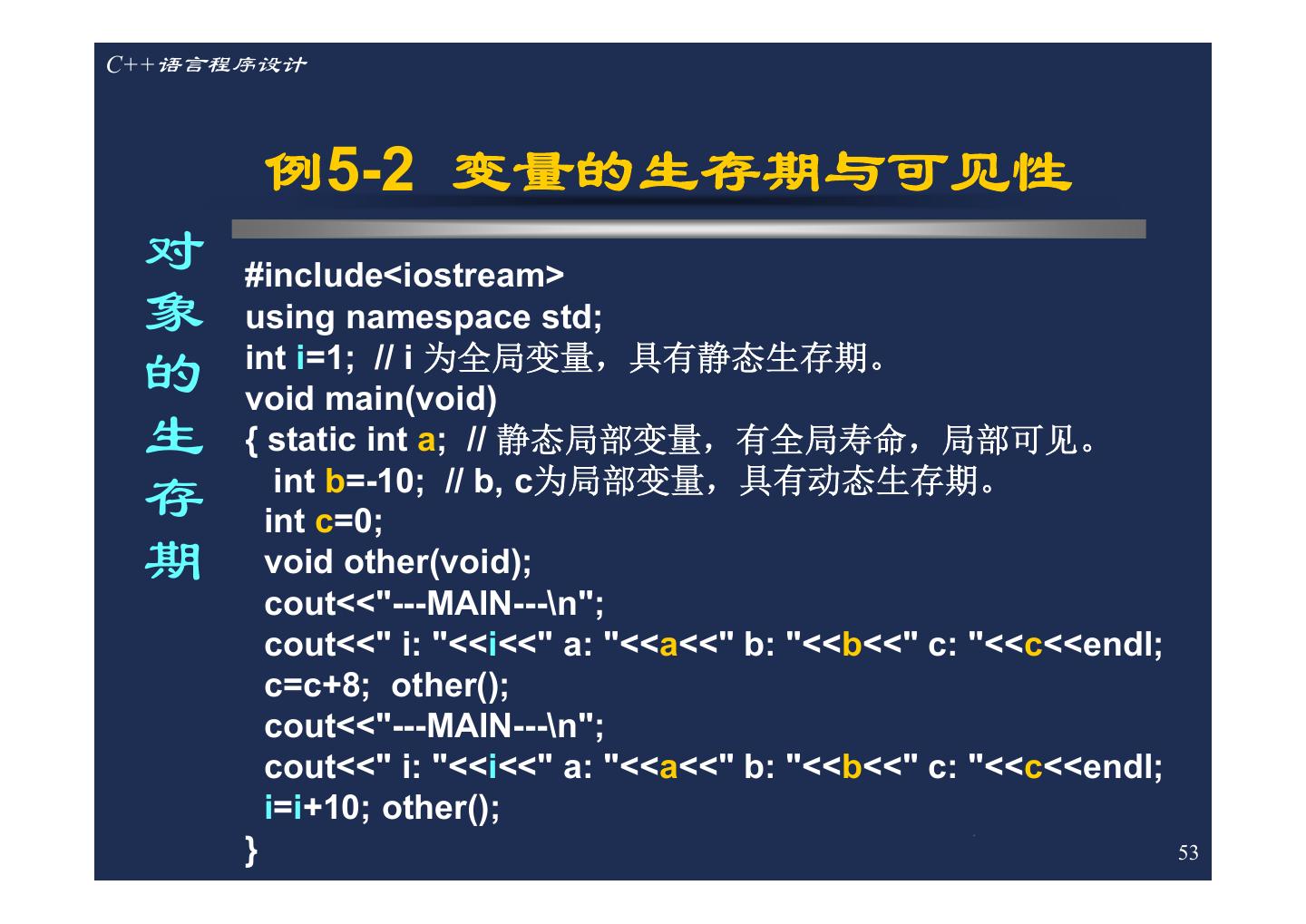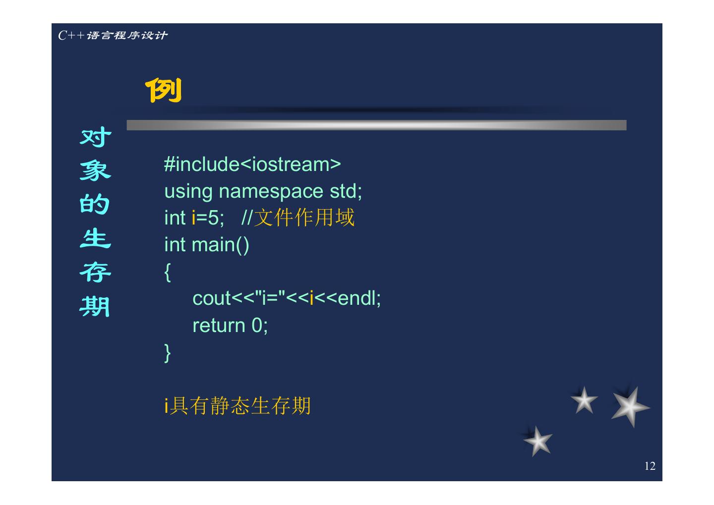 12 .C++语言程序设计 对象的生存期 例 #include<iostream> using namespace std; int i=5; //文件作用域 int main() { cout<<"i="<<i<<endl; return 0; } i具有静态生存期 12