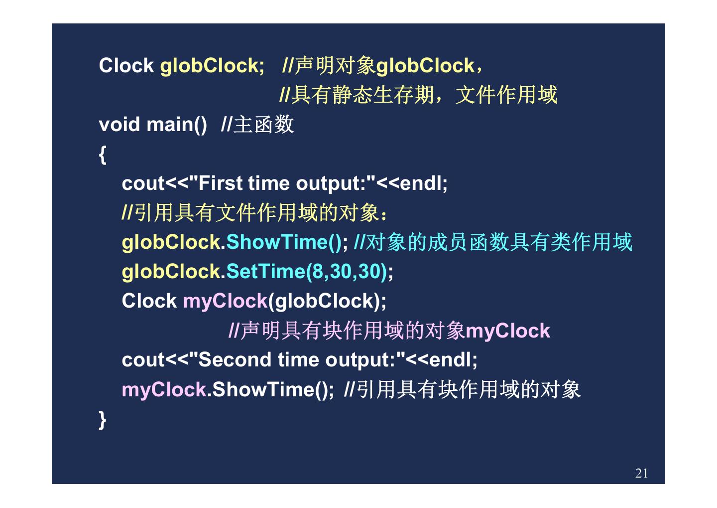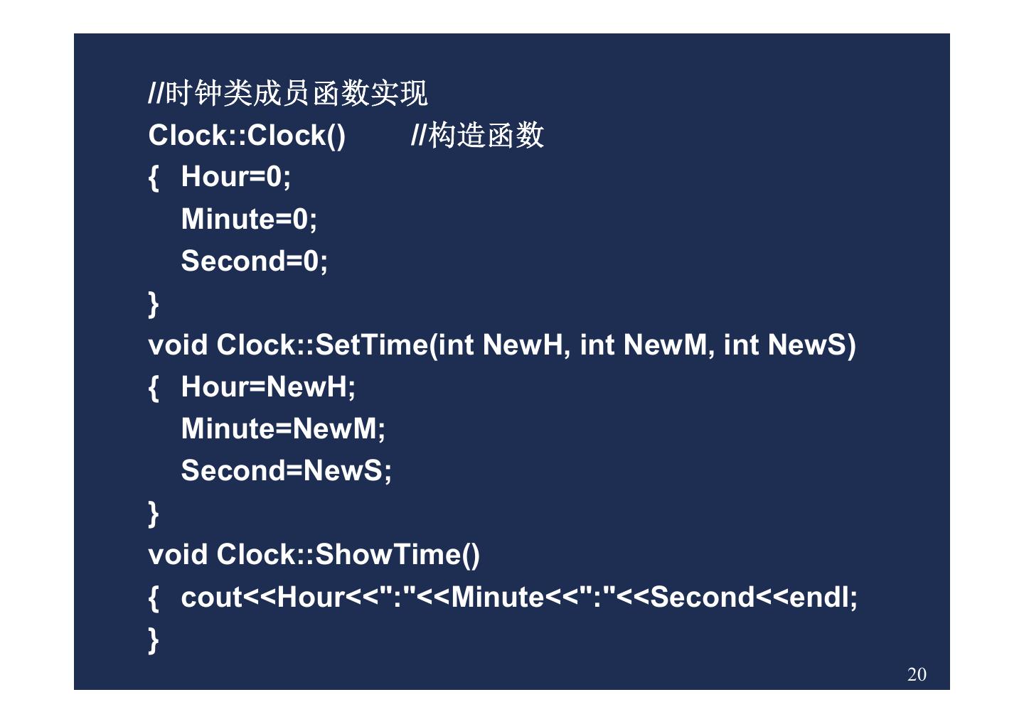 16 .//时钟类成员函数实现 Clock::Clock() //构造函数 { Hour=0; Minute=0; Second=0; } void Clock::SetTime(int NewH, int NewM, int NewS) { Hour=NewH; Minute=NewM; Second=NewS; } void Clock::ShowTime() { cout<<Hour<<":"<<Minute<<":"<<Second<<endl; } 20