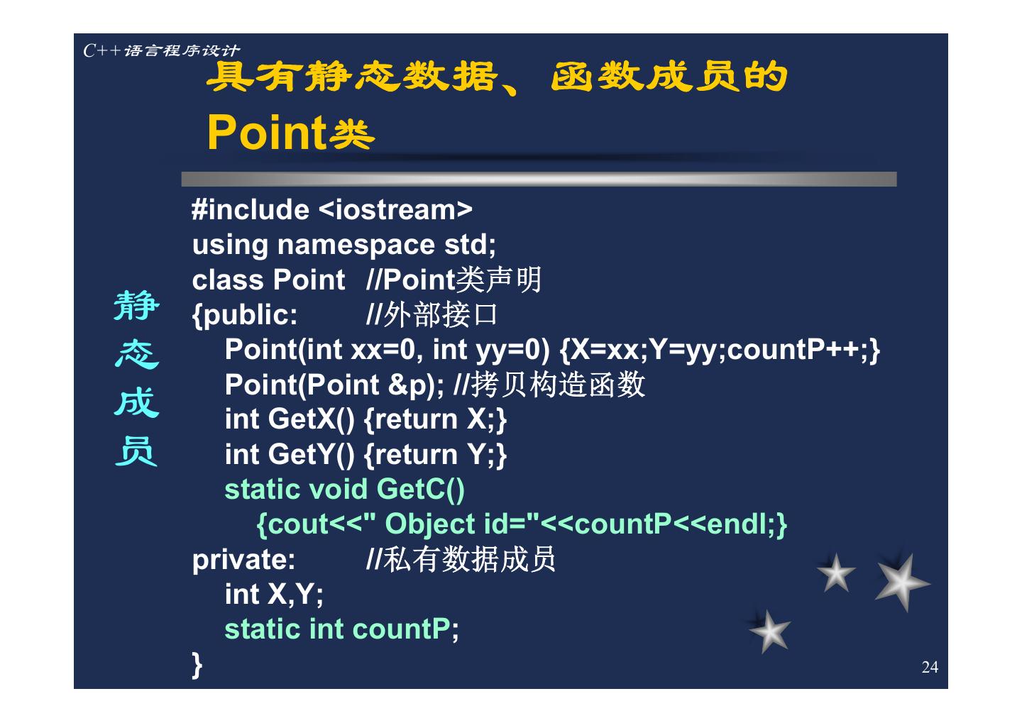 24 .C++语言程序设计 具有静态数据、函数成员的 Point类 #include <iostream> 静态成员 using namespace std; class Point //Point类声明 {public: //外部接口 Point(int xx=0, int yy=0) {X=xx;Y=yy;countP++;} Point(Point &p); //拷贝构造函数 int GetX() {return X;} int GetY() {return Y;} static void GetC() {cout<<" Object id="<<countP<<endl;} private: //私有数据成员 int X,Y; static int countP; } 24