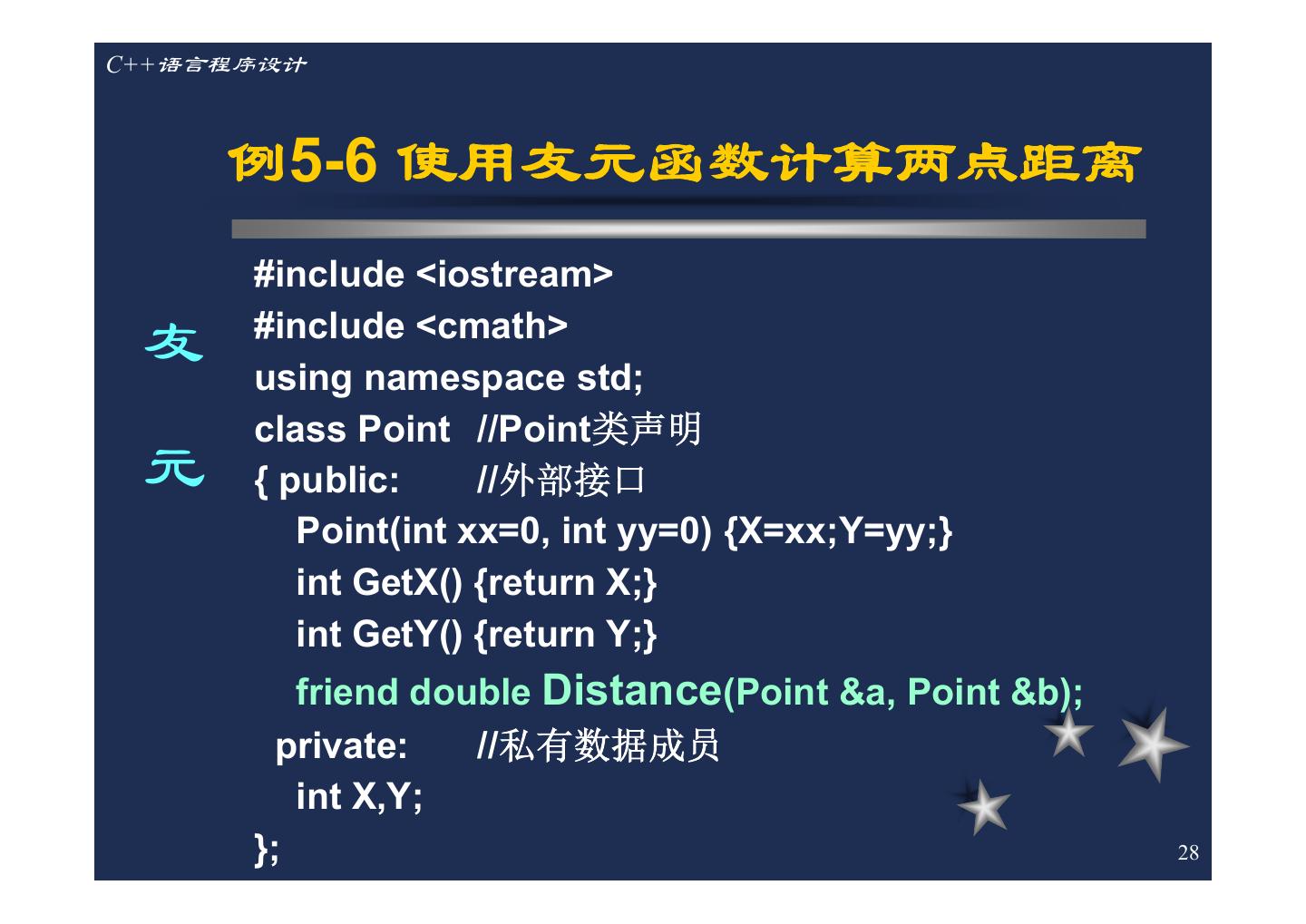 27 .C++语言程序设计 友 友元函数 友元函数是在类声明中由关键字friend 修饰说明的非成员函数,在它的函数 元 体中能够通过对象名访问 private 和 protected成员 作用:增加灵活性,使程序员可以在 封装和快速性方面做合理选择。 访问对象中的成员必须通过对象名。 27