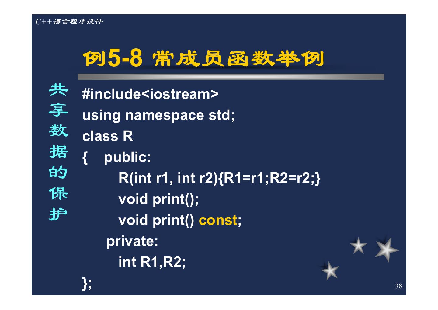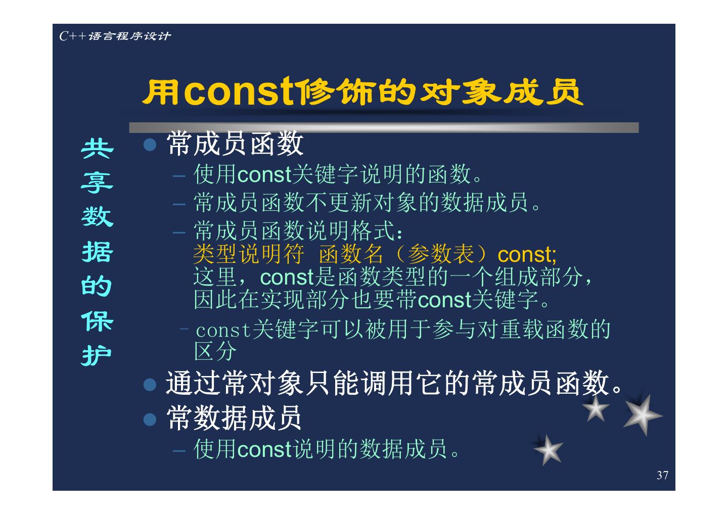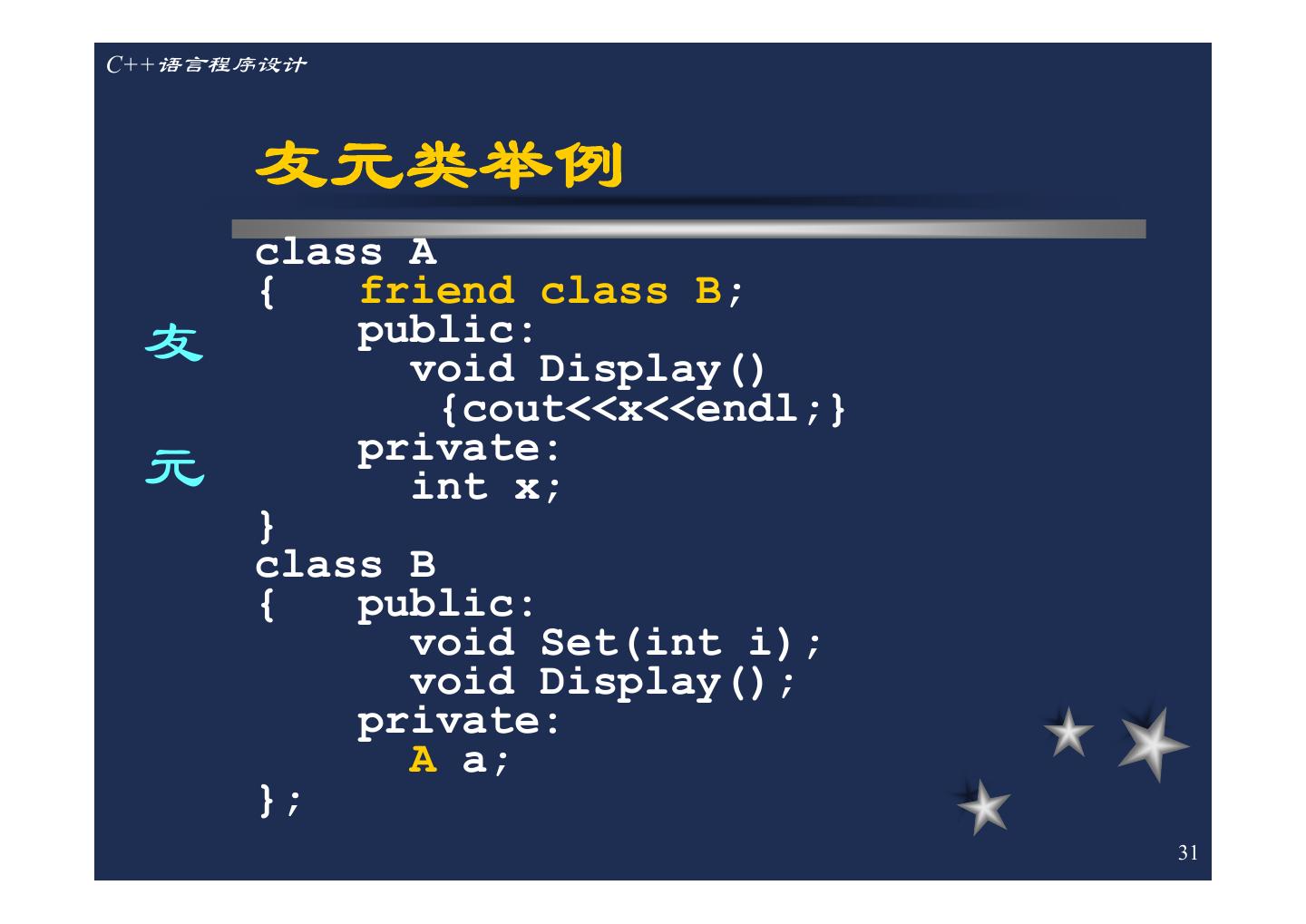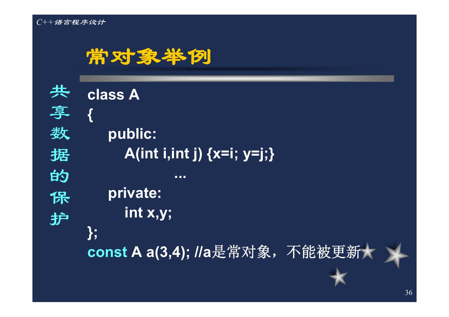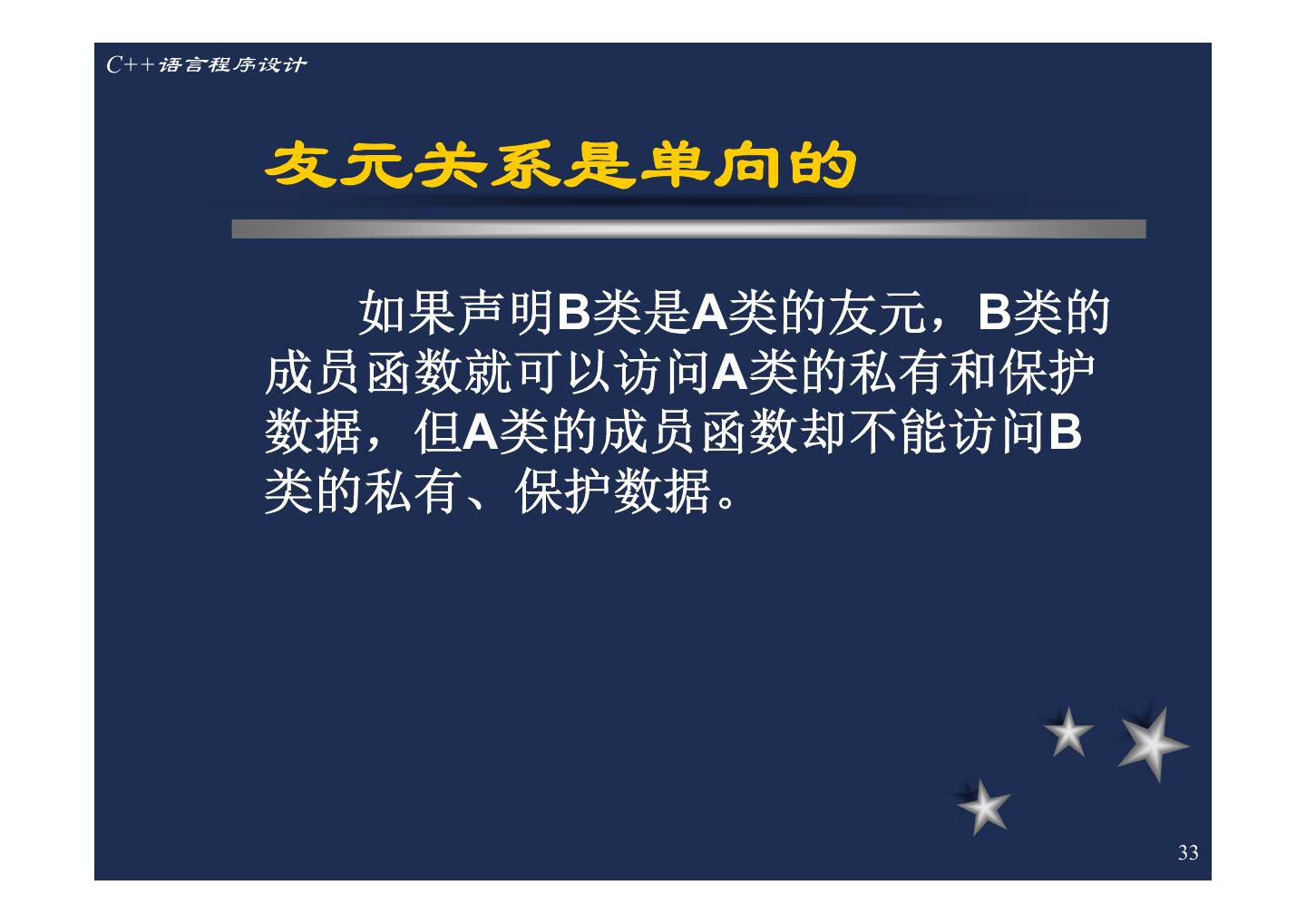 23 .C++语言程序设计 静态成员函数举例 class A 静态成员 { public: static void f(A a); private: int x; }; void A::f(A a) { cout<<x; //对x的引用是错误的 cout<<a.x; //正确 } 23