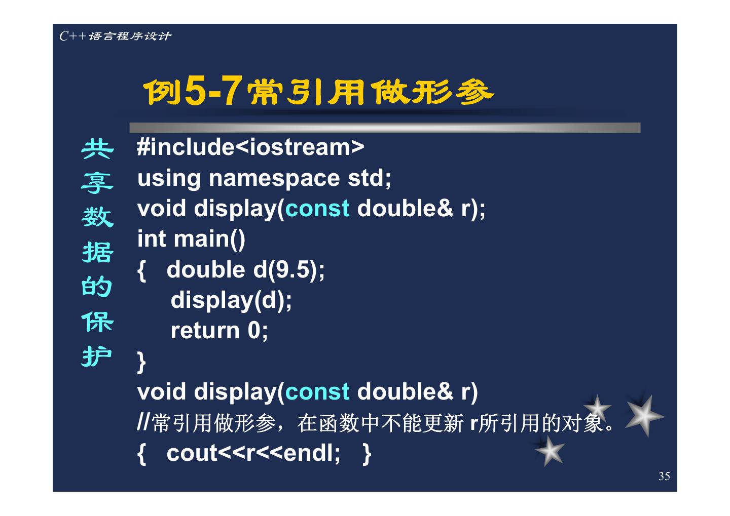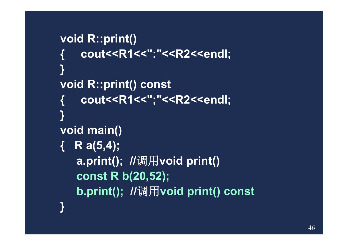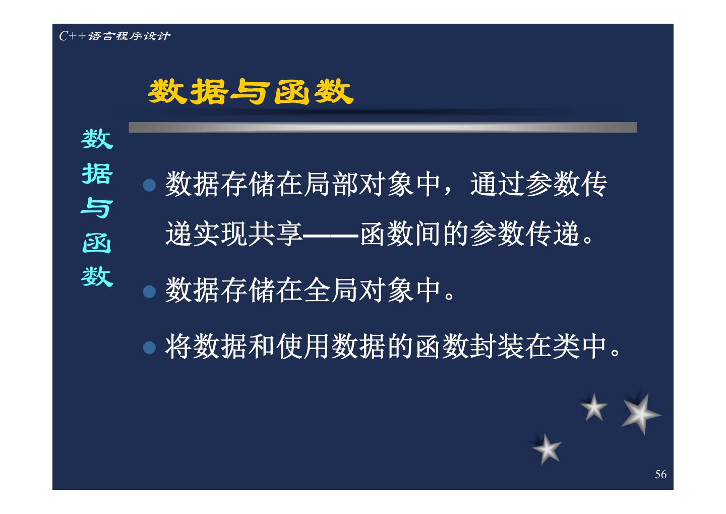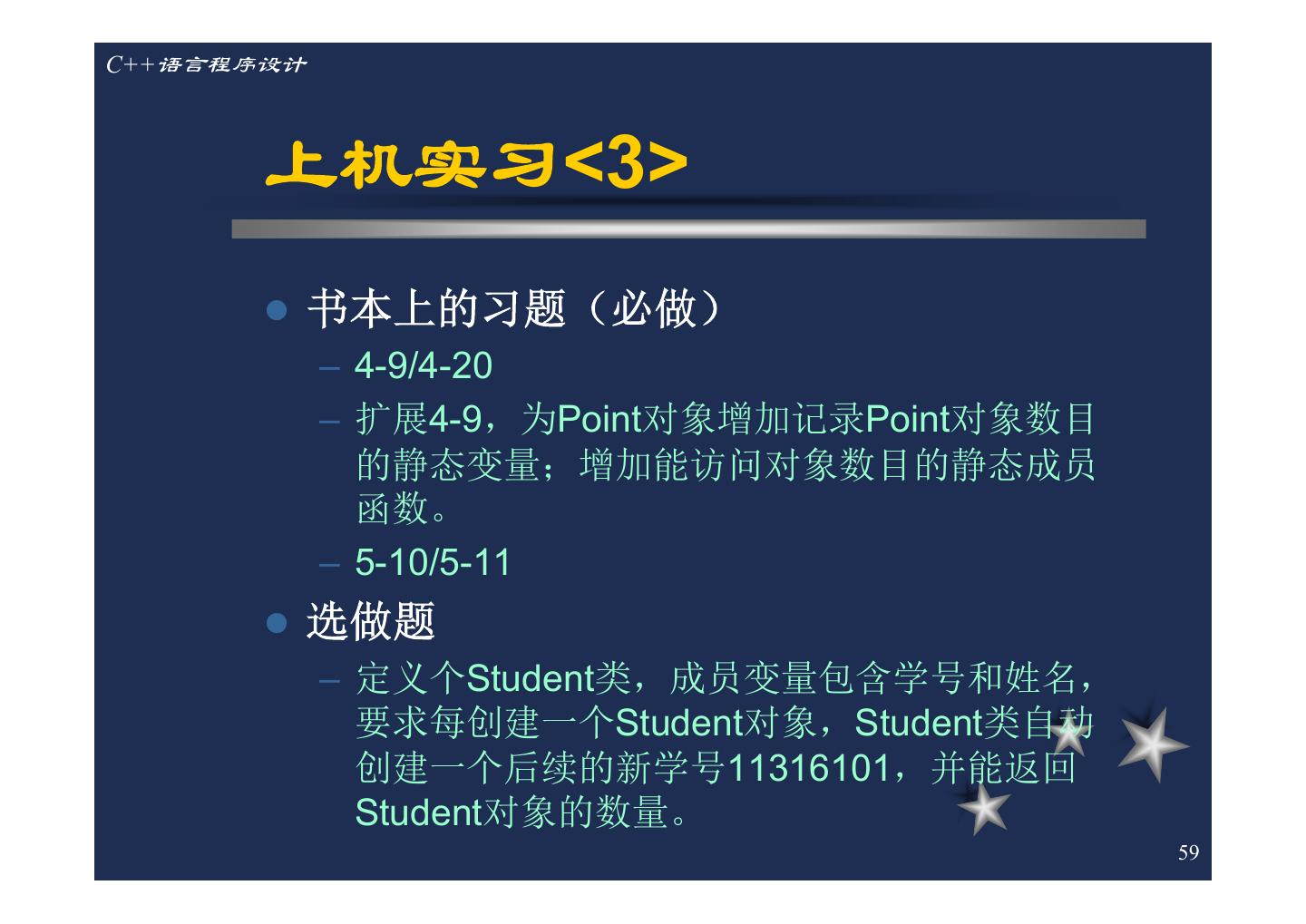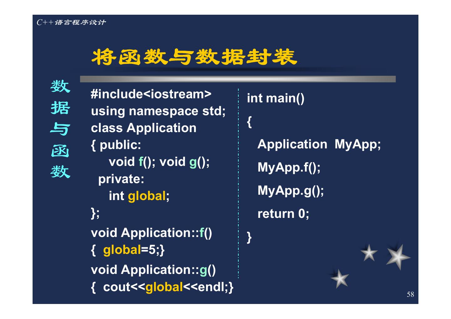 23 .C++语言程序设计 静态成员函数举例 class A 静态成员 { public: static void f(A a); private: int x; }; void A::f(A a) { cout<<x; //对x的引用是错误的 cout<<a.x; //正确 } 23
