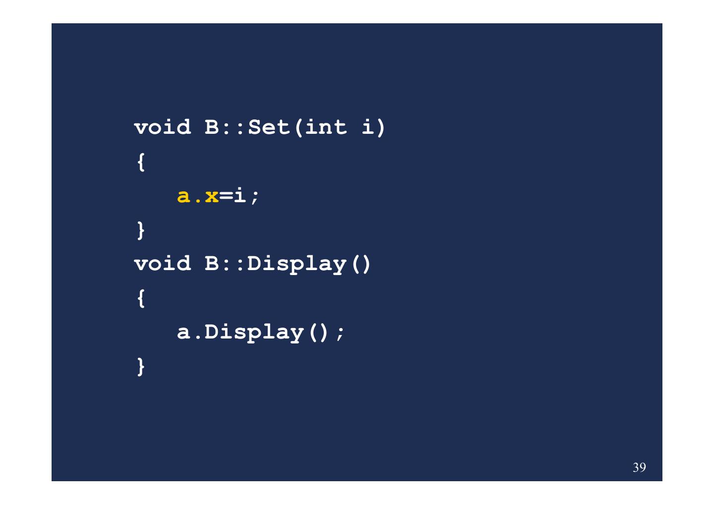 29 .double Distance( Point& a, Point& b) { double dx=a.X-b.X; double dy=a.Y-b.Y; return sqrt(dx*dx+dy*dy); } int main() { Point p1(3.0, 5.0), p2(4.0, 6.0); double d=Distance(p1, p2); cout<<"The distance is "<<d<<endl; return 0; } 36