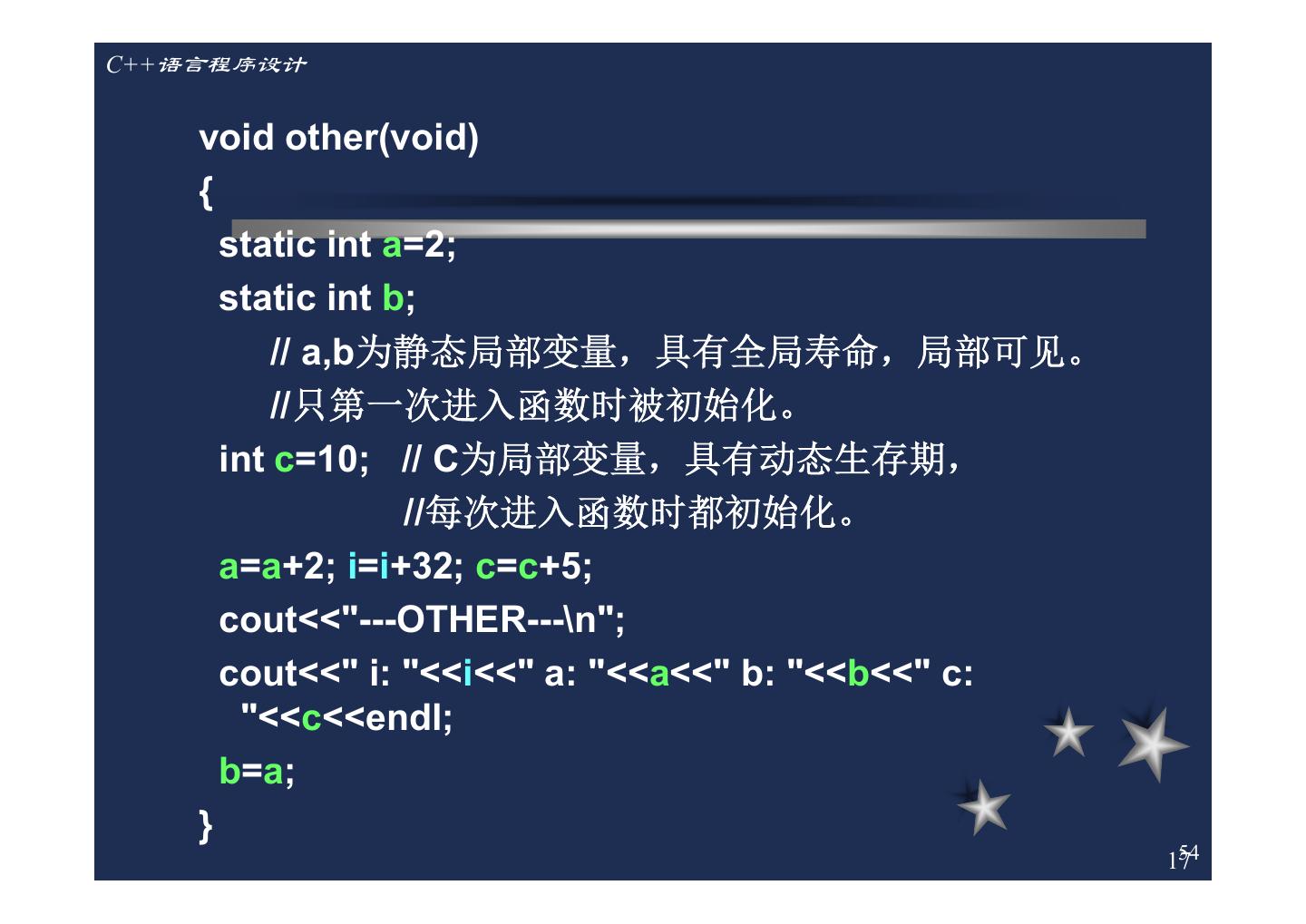 13 .C++语言程序设计 对象的生存期 动态生存期 块作用域中声明的,没有用static修 饰的对象是动态生存期的对象(习惯 称局部生存期对象)。 开始于程序执行到声明点时,结束于 命名该标识符的作用域结束处。 13