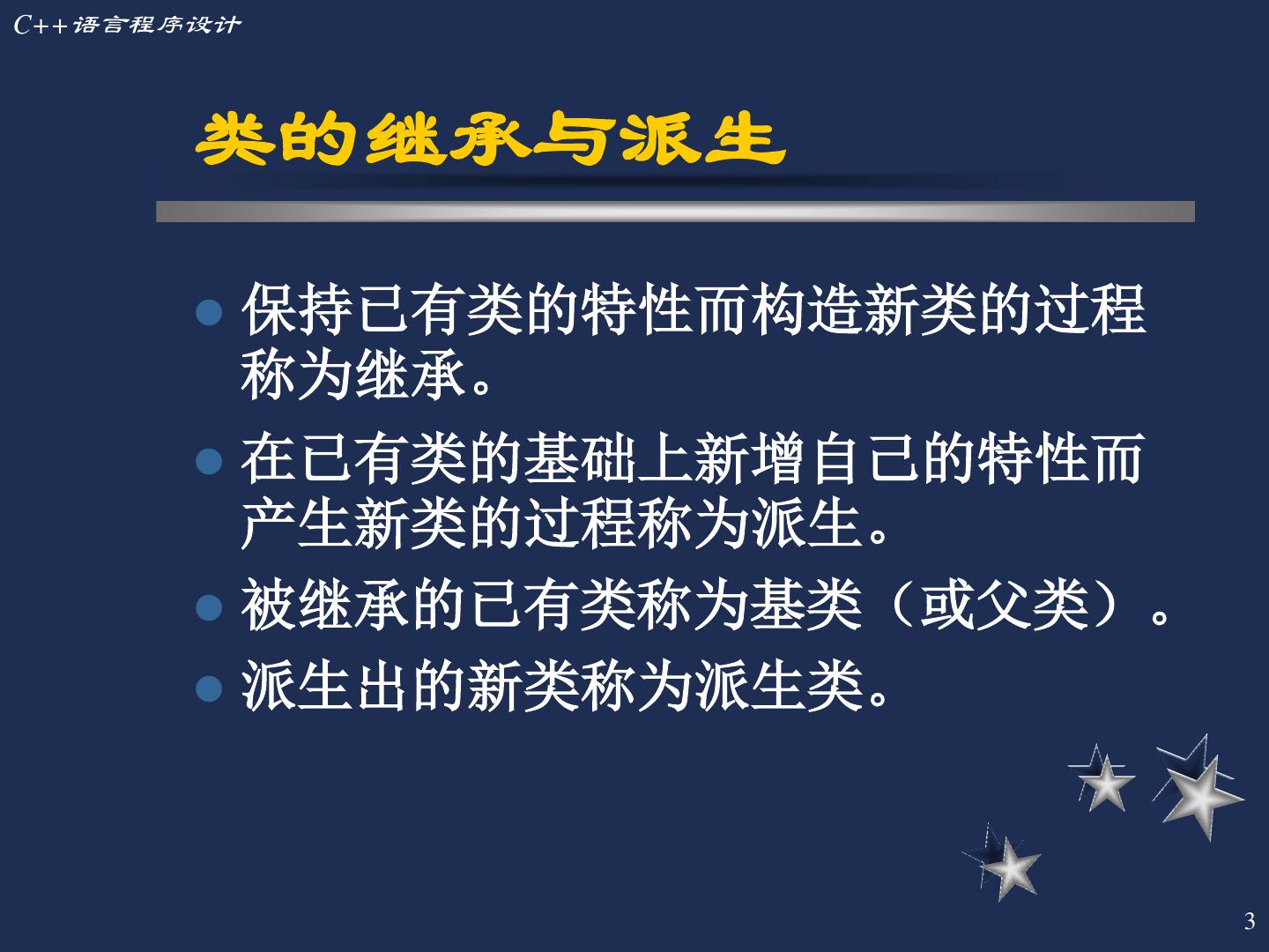 3 .C++语言程序设计 类的继承与派生 保持已有类的特性而构造新类的过程 称为继承。 在已有类的基础上新增自己的特性而 产生新类的过程称为派生。 被继承的已有类称为基类(或父类)。 派生出的新类称为派生类。 3