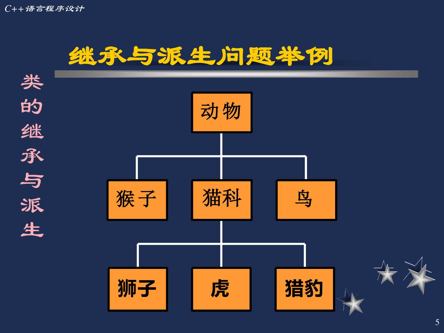 5 .C++语言程序设计 继承与派生问题举例 类 的 动物 继 承 与 派 猴子 猫科 猫 鸟 生 狮子 虎 猎豹 5