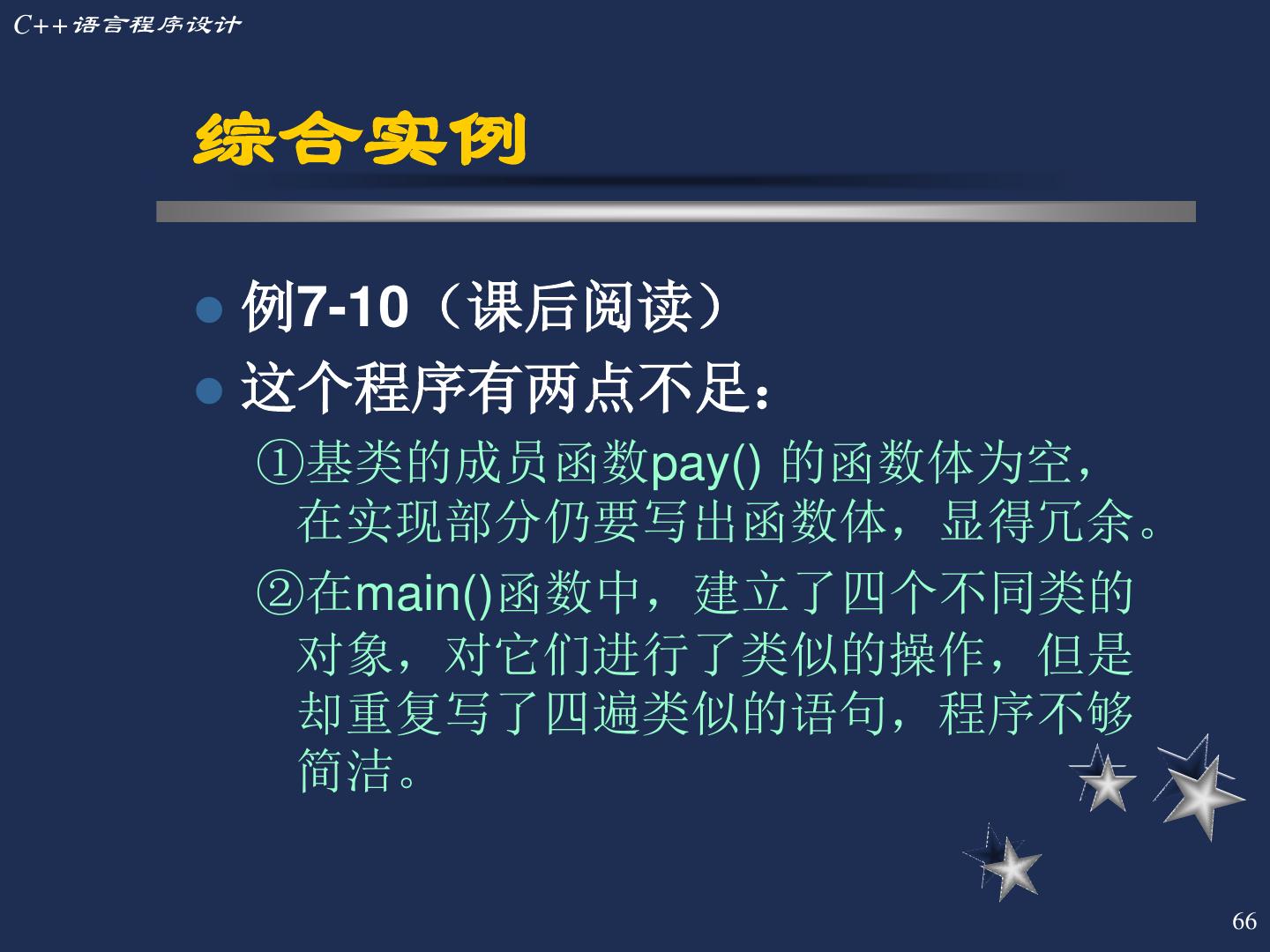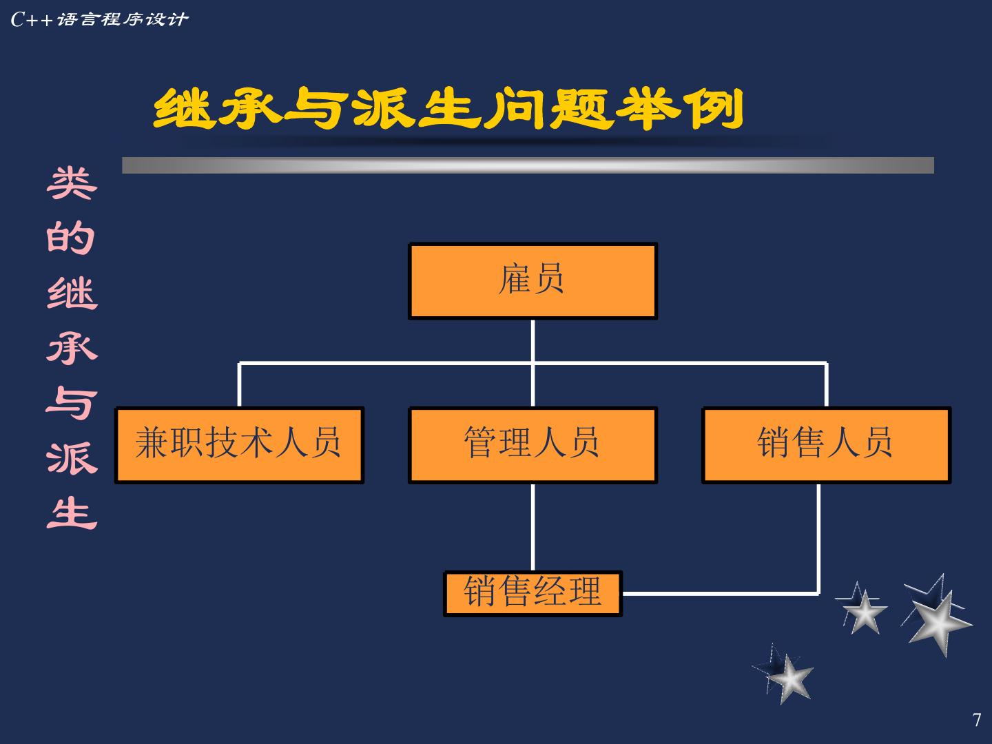 7 .C++语言程序设计 继承与派生问题举例 类 的 雇员 继 承 与 兼职技术人员 管理人员 销售人员 派 生 销售经理 7