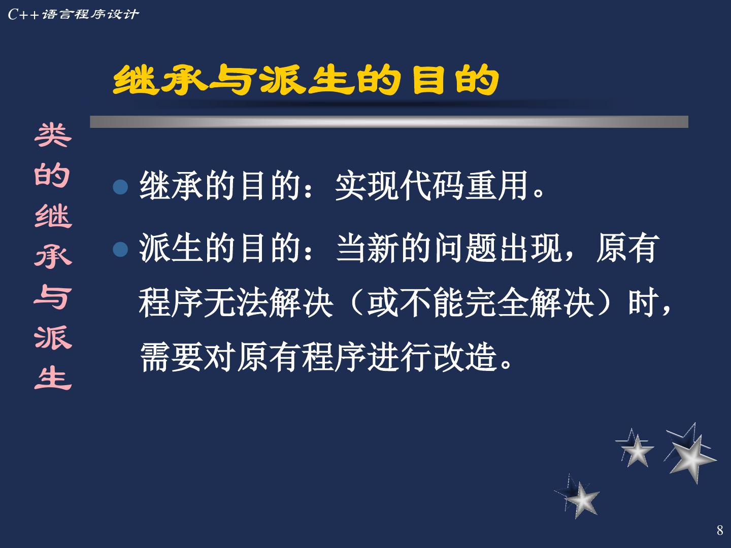8 .C++语言程序设计 继承与派生的目的 类 的 继承的目的:实现代码重用。 继 承 派生的目的:当新的问题出现,原有 与 程序无法解决(或不能完全解决)时, 派 需要对原有程序进行改造。 生 8