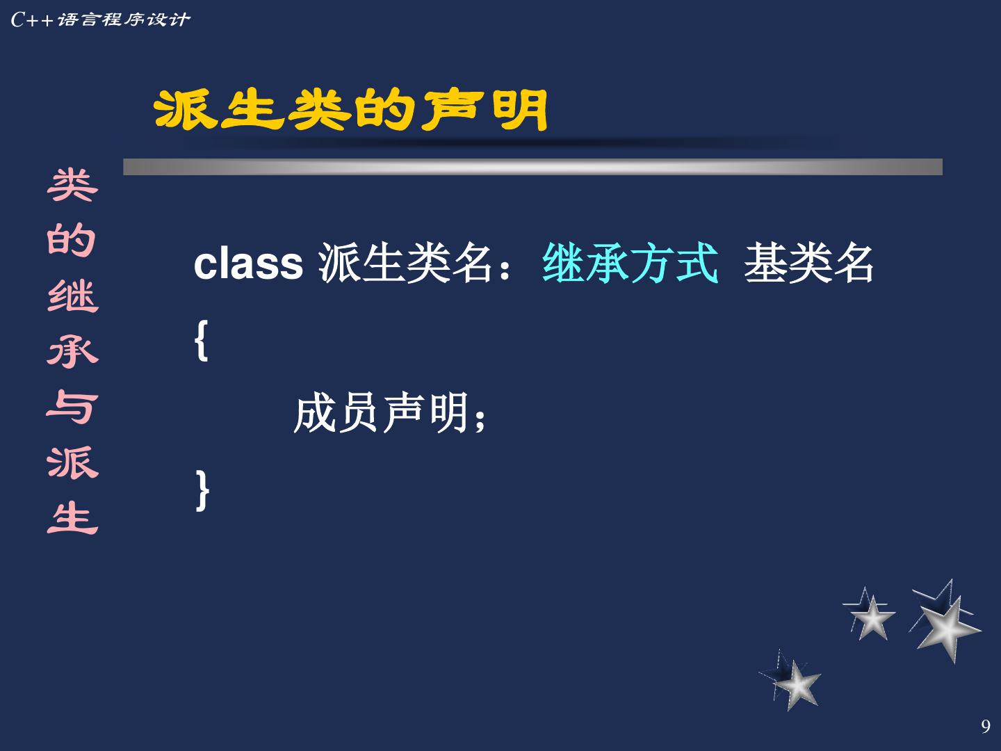 9 .C++语言程序设计 派生类的声明 类 的 class 派生类名:继承方式 基类名 继 承 { 与 成员声明; 派 } 生 9