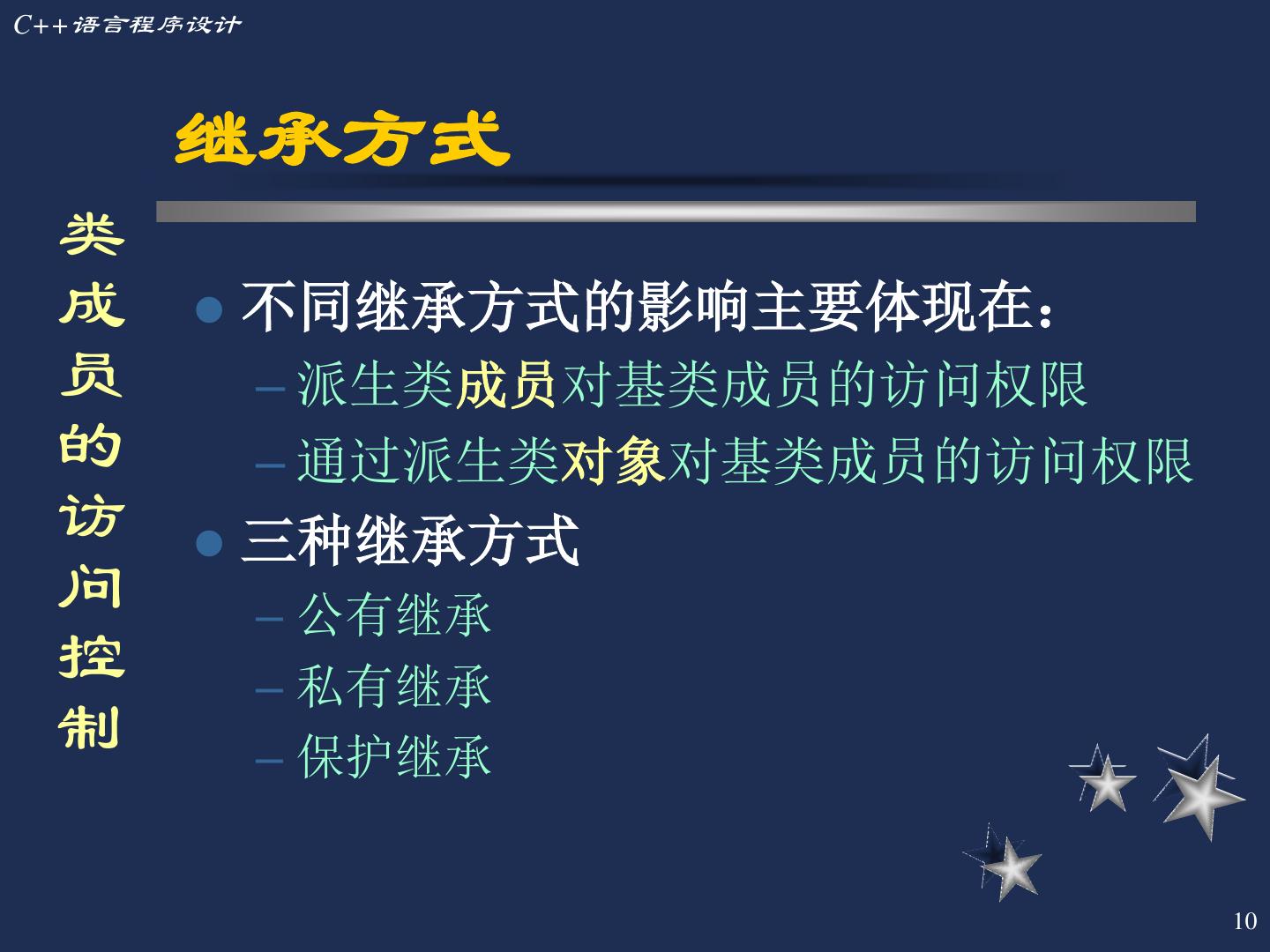 10 .C++语言程序设计 继承方式 类 成 不同继承方式的影响主要体现在: 员 – 派生类成员对基类成员的访问权限 的 – 通过派生类对象对基类成员的访问权限 访 三种继承方式 问 – 公有继承 控 – 私有继承 制 – 保护继承 10