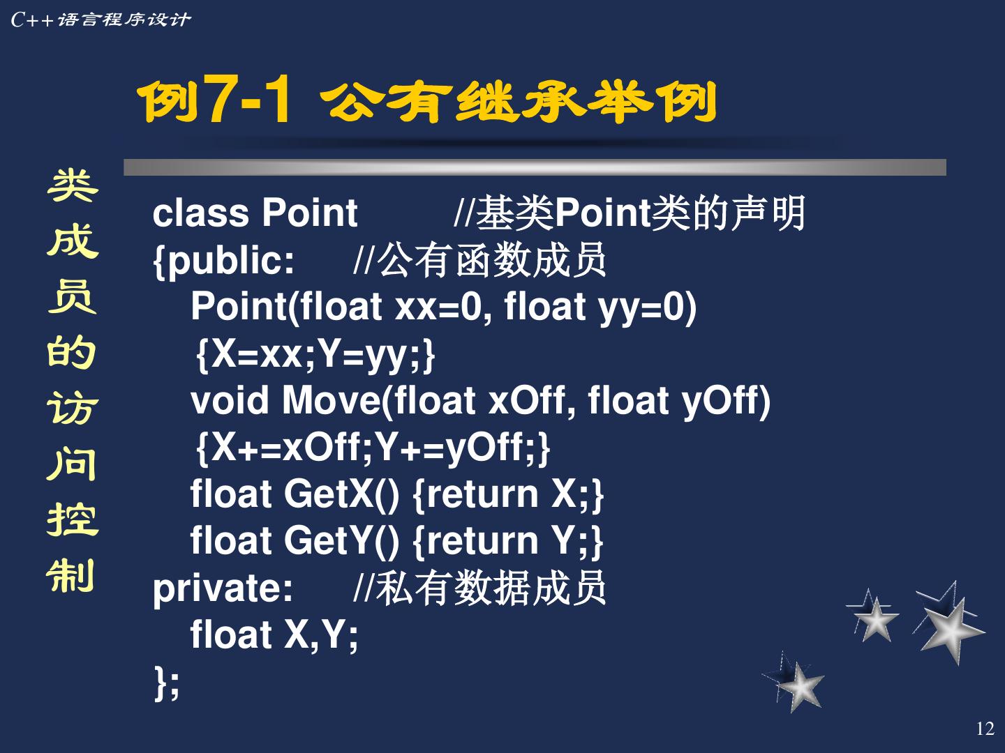 12 .C++语言程序设计 例7-1 公有继承举例 类 class Point //基类Point类的声明 成 {public: //公有函数成员 员 Point(float xx=0, float yy=0) 的 {X=xx;Y=yy;} 访 void Move(float xOff, float yOff) {X+=xOff;Y+=yOff;} 问 float GetX() {return X;} 控 float GetY() {return Y;} 制 private: //私有数据成员 float X,Y; }; 12