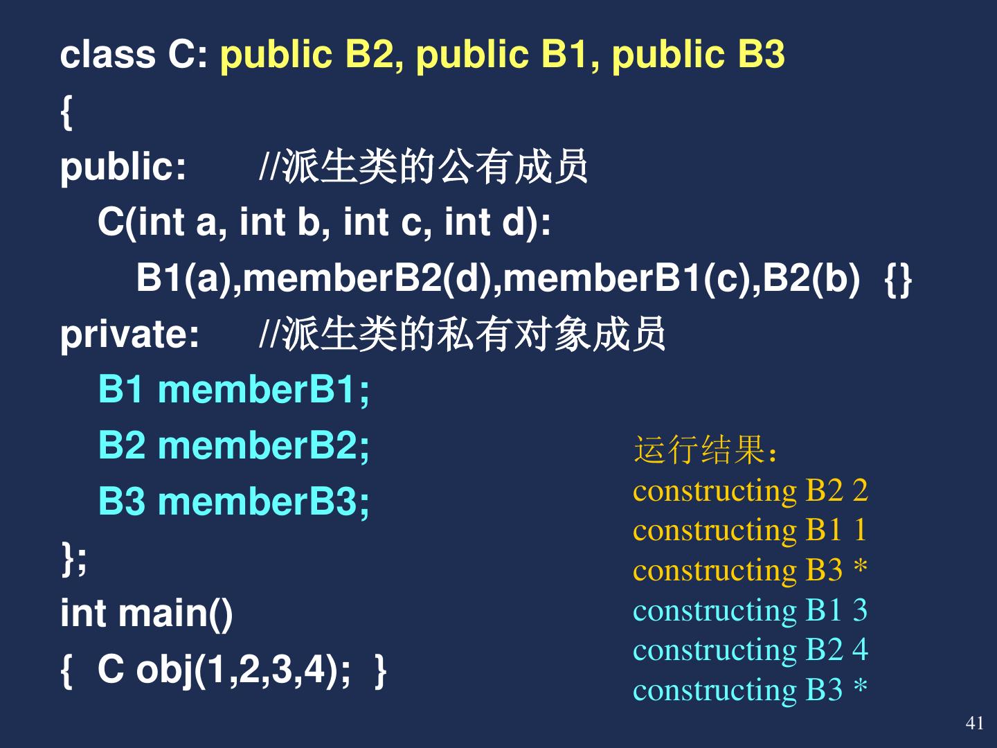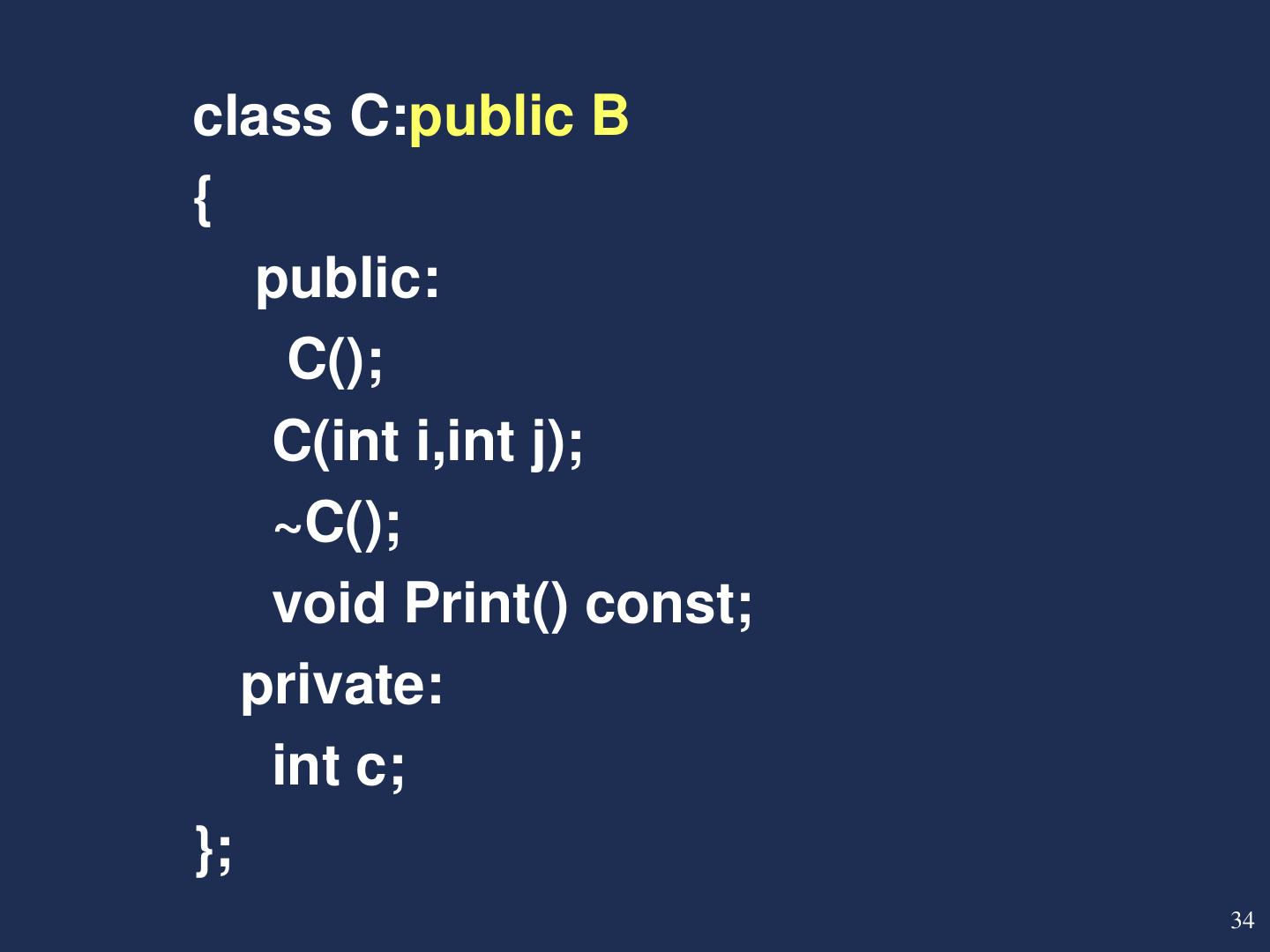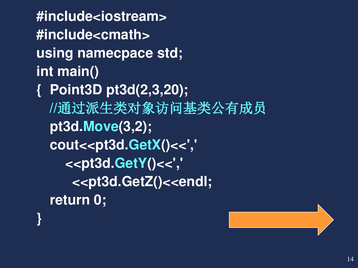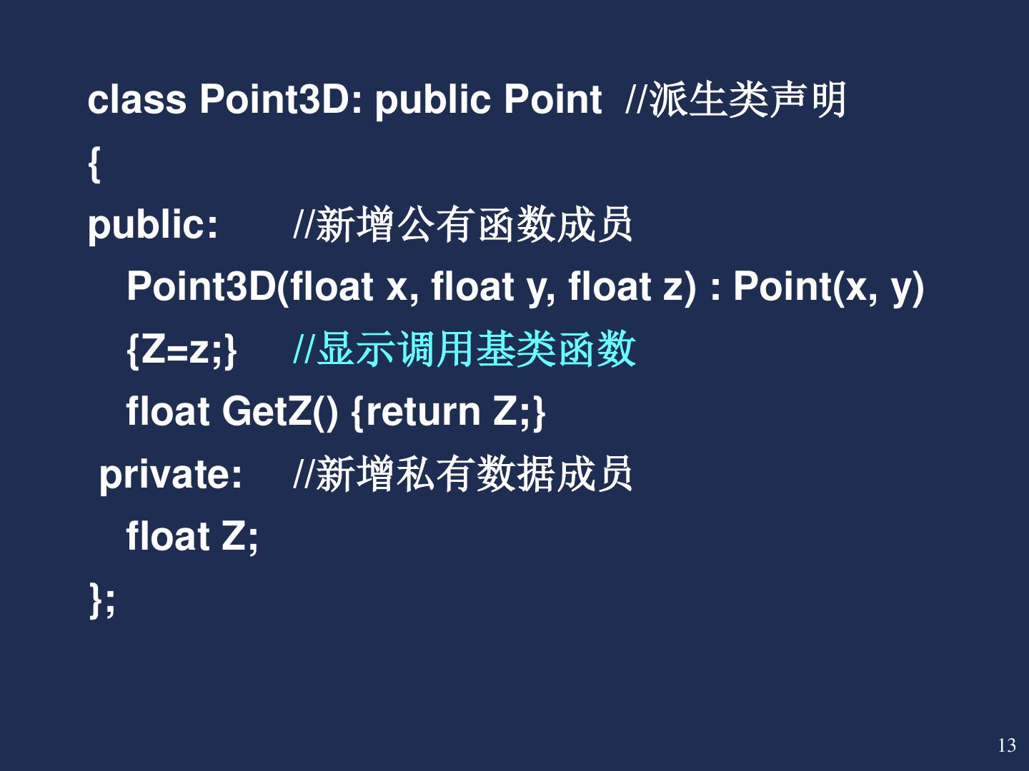 13 .class Point3D: public Point //派生类声明 { public: //新增公有函数成员 Point3D(float x, float y, float z) : Point(x, y) {Z=z;} //显示调用基类函数 float GetZ() {return Z;} private: //新增私有数据成员 float Z; }; 13