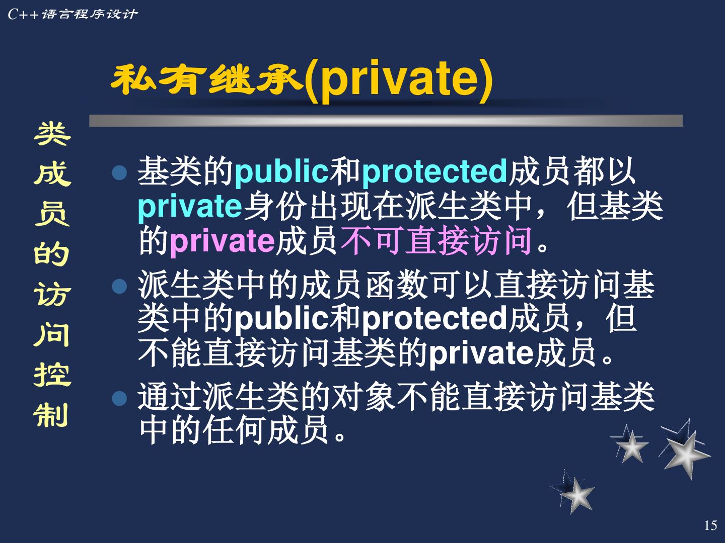15 .C++语言程序设计 私有继承(private) 类 成 基类的public和protected成员都以 员 private身份出现在派生类中,但基类 的 的private成员不可直接访问。 访 派生类中的成员函数可以直接访问基 类中的public和protected成员,但 问 不能直接访问基类的private成员。 控 通过派生类的对象不能直接访问基类 制 中的任何成员。 15