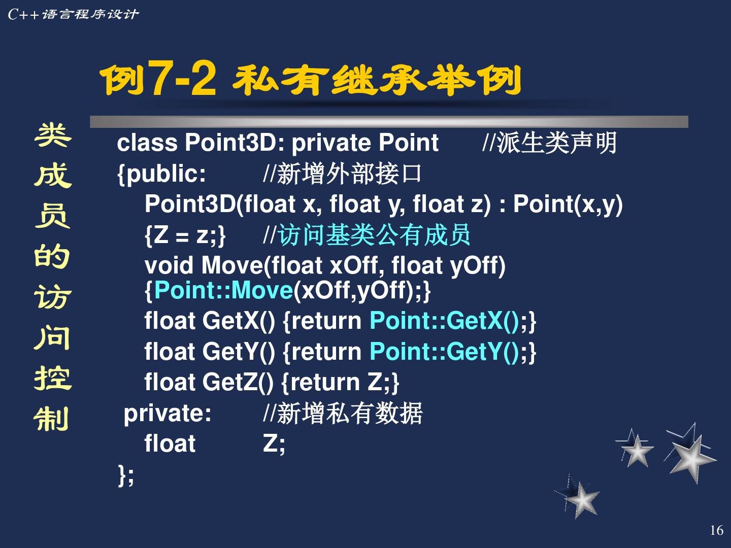 16 .C++语言程序设计 例7-2 私有继承举例 类 class Point3D: private Point //派生类声明 成 {public: //新增外部接口 员 Point3D(float x, float y, float z) : Point(x,y) {Z = z;} //访问基类公有成员 的 void Move(float xOff, float yOff) 访 {Point::Move(xOff,yOff);} float GetX() {return Point::GetX();} 问 float GetY() {return Point::GetY();} 控 float GetZ() {return Z;} 制 private: float //新增私有数据 Z; }; 16