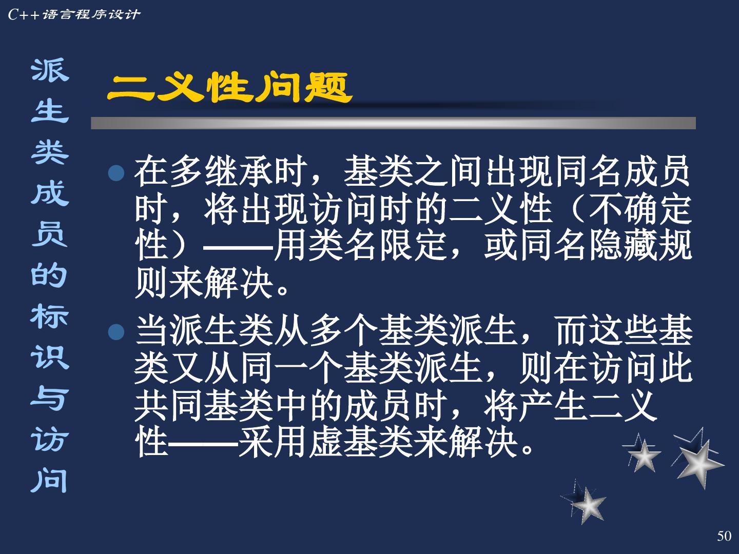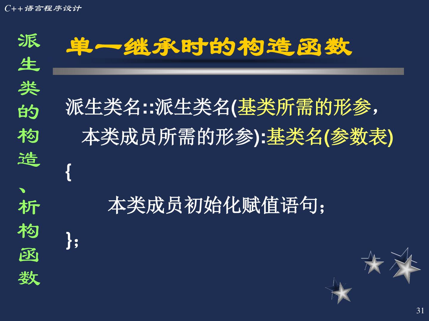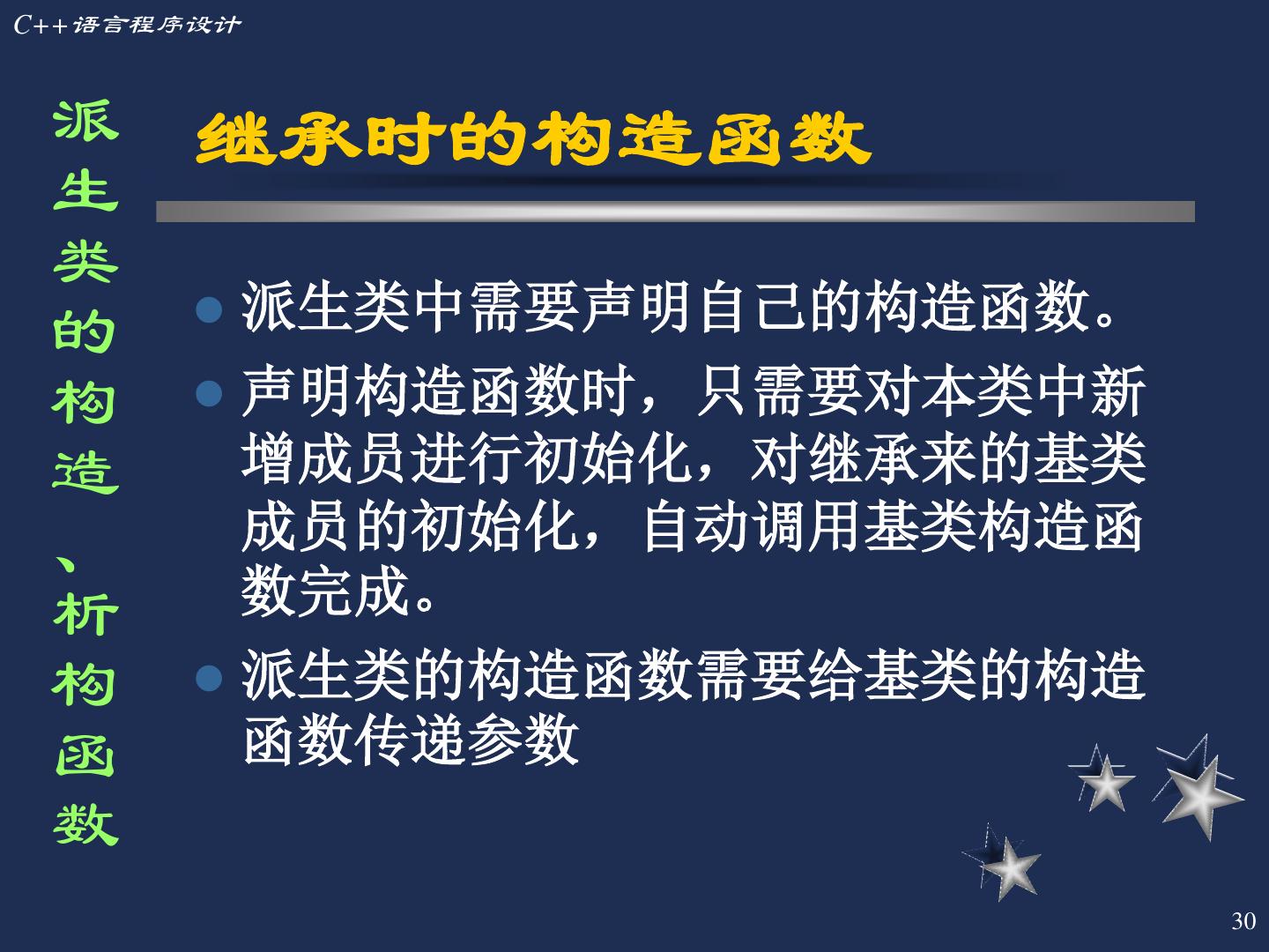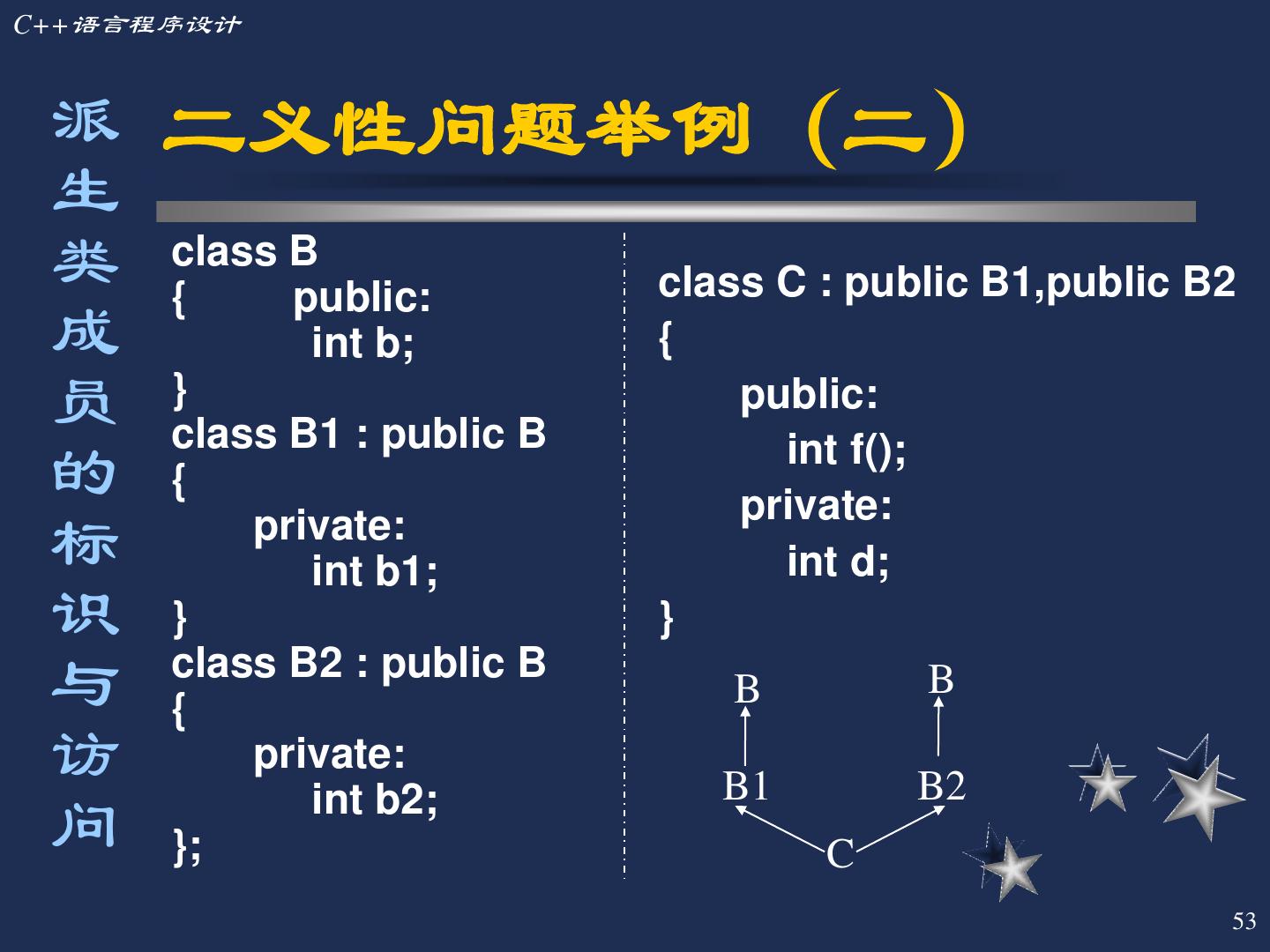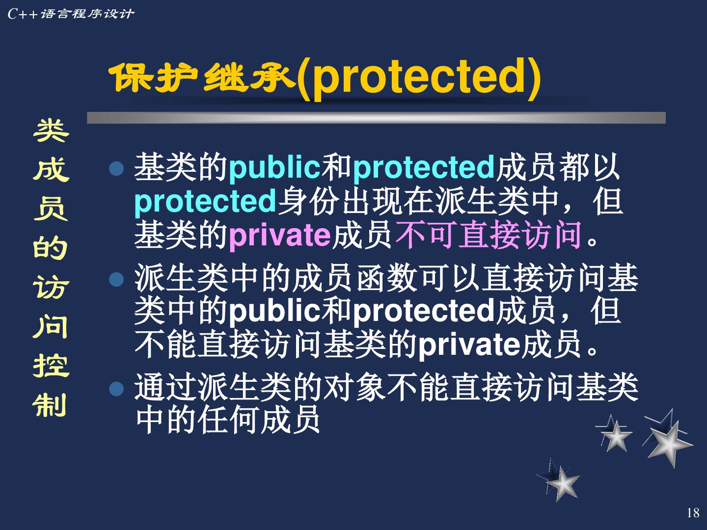 2 .C++语言程序设计 本章主要内容 类的继承 类成员的访问控制 单继承与多继承 派生类的构造、析构函数 类成员的标识与访问 2