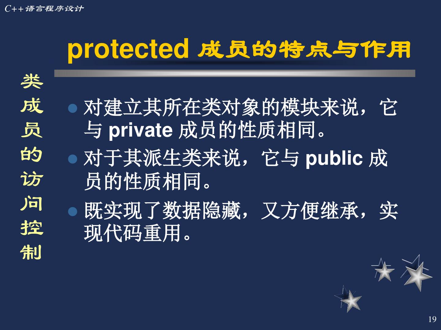 19 .C++语言程序设计 protected 成员的特点与作用 类 成 对建立其所在类对象的模块来说,它 员 与 private 成员的性质相同。 的 对于其派生类来说,它与 public 成 访 员的性质相同。 问 既实现了数据隐藏,又方便继承,实 控 现代码重用。 制 19