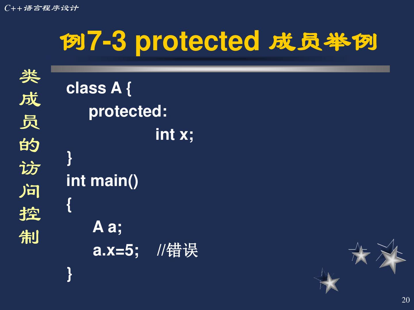 20 .C++语言程序设计 例7-3 protected 成员举例 类 class A { 成 protected: 员 int x; 的 } 访 int main() 问 { 控 A a; 制 a.x=5; //错误 } 20