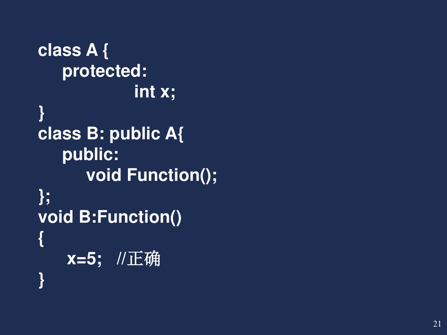 21 .class A { protected: int x; } class B: public A{ public: void Function(); }; void B:Function() { x=5; //正确 } 21