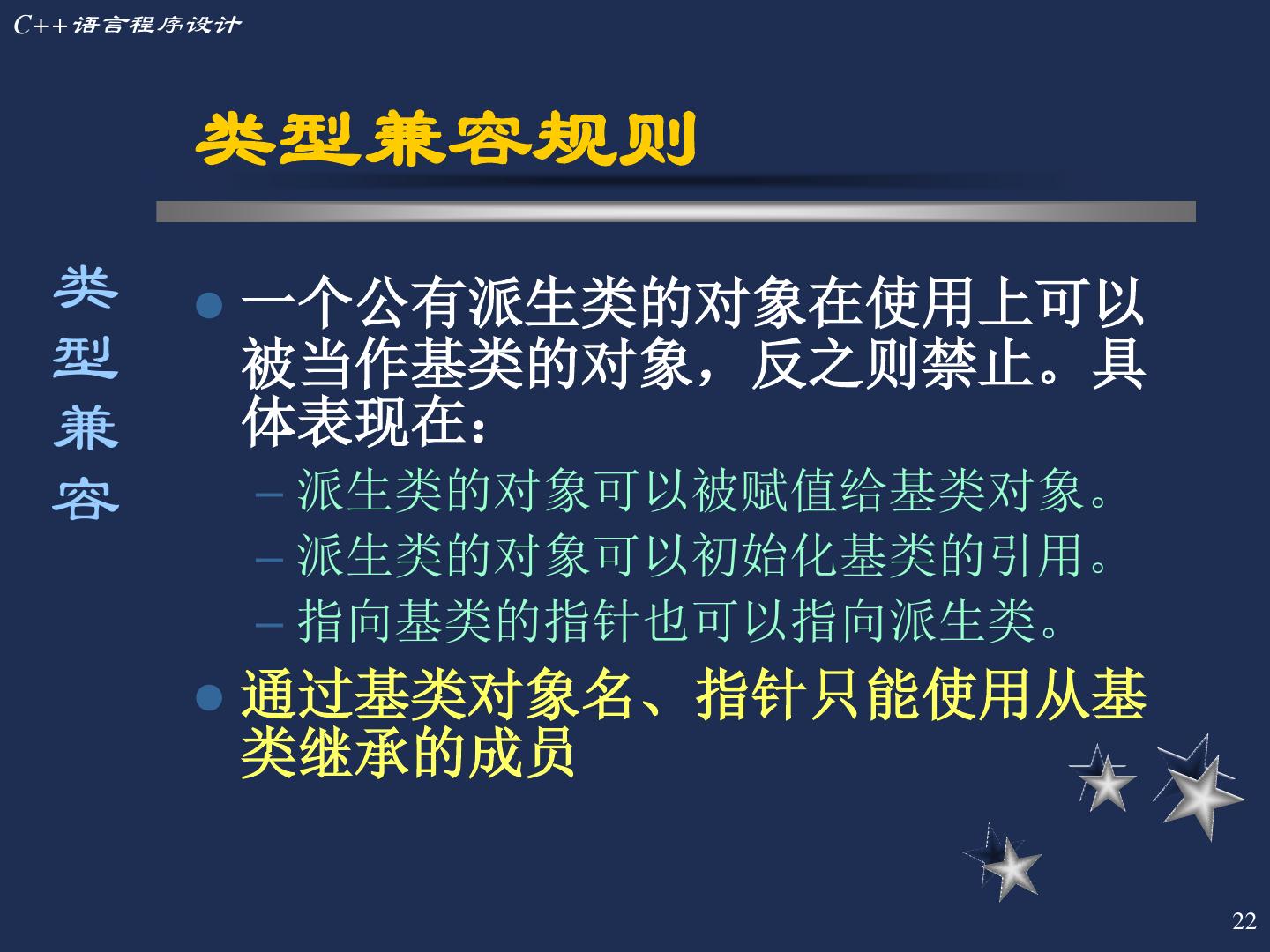 22 .C++语言程序设计 类型兼容规则 类 一个公有派生类的对象在使用上可以 型 被当作基类的对象,反之则禁止。具 兼 体表现在: 容 – 派生类的对象可以被赋值给基类对象。 – 派生类的对象可以初始化基类的引用。 – 指向基类的指针也可以指向派生类。 通过基类对象名、指针只能使用从基 类继承的成员 22