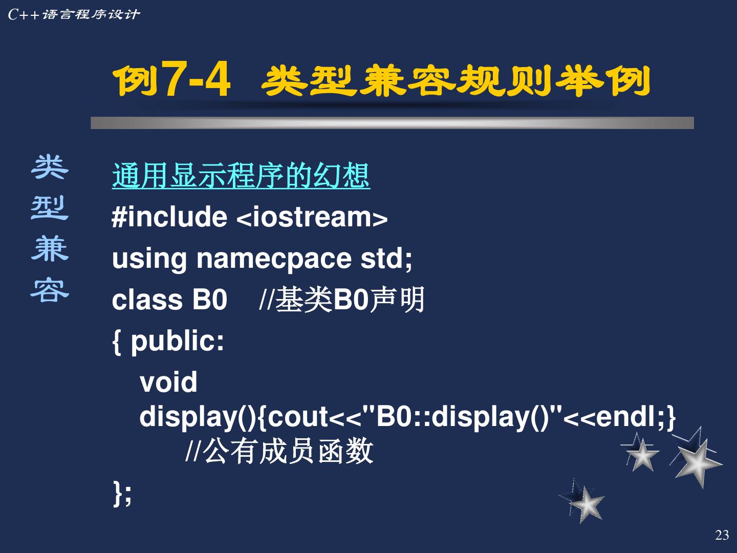 23 .C++语言程序设计 例7-4 类型兼容规则举例 类 通用显示程序的幻想 型 #include <iostream> 兼 using namecpace std; 容 class B0 //基类B0声明 { public: void display(){cout<<"B0::display()"<<endl;} //公有成员函数 }; 23