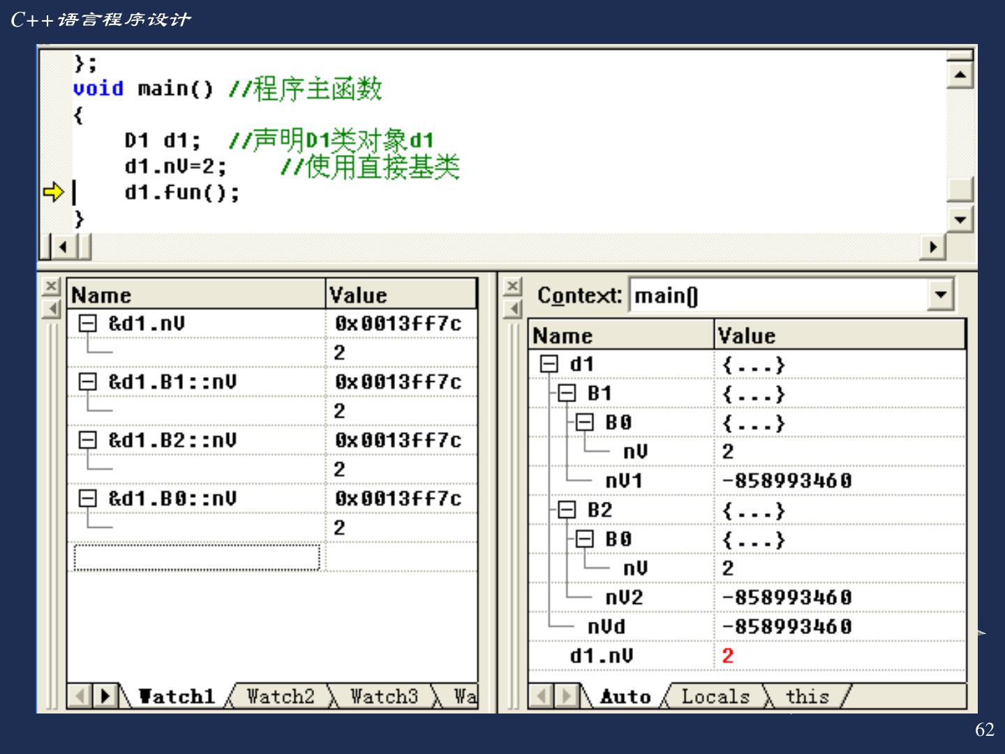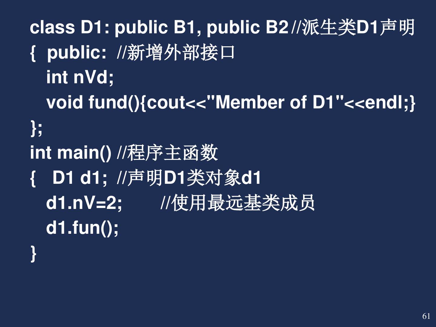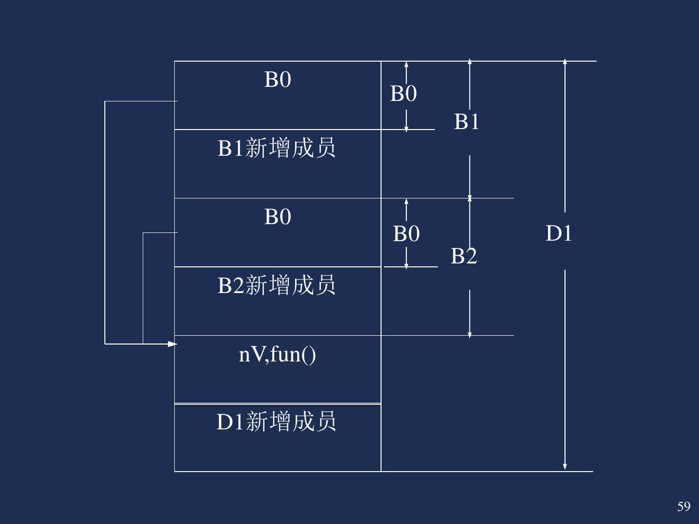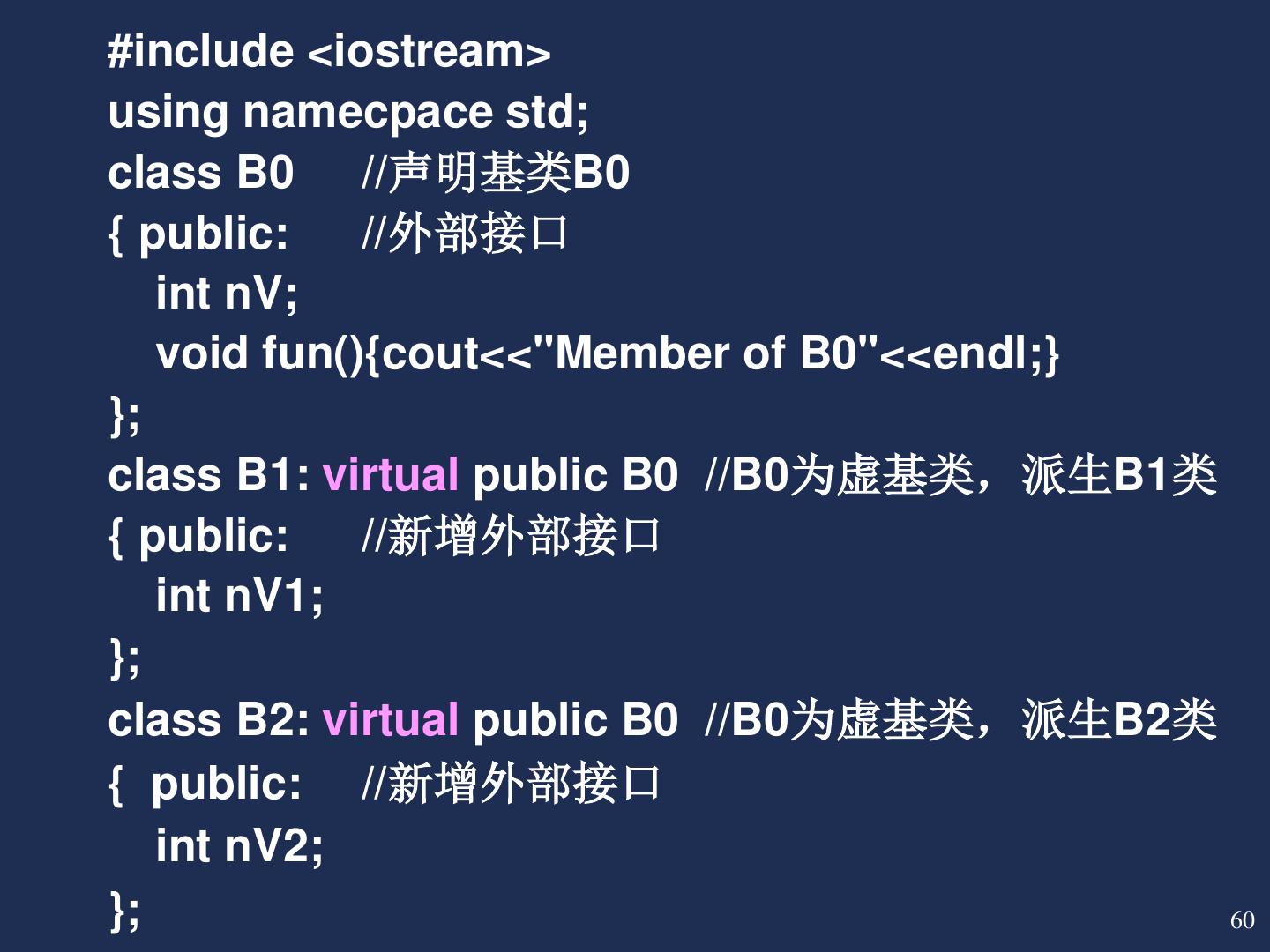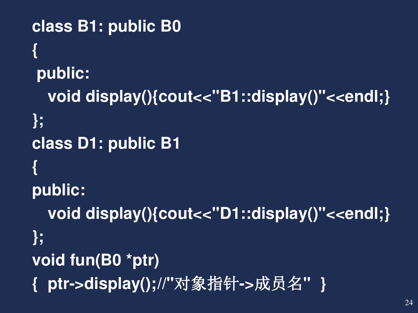 24 .class B1: public B0 { public: void display(){cout<<"B1::display()"<<endl;} }; class D1: public B1 { public: void display(){cout<<"D1::display()"<<endl;} }; void fun(B0 *ptr) { ptr->display();//"对象指针->成员名" } 24