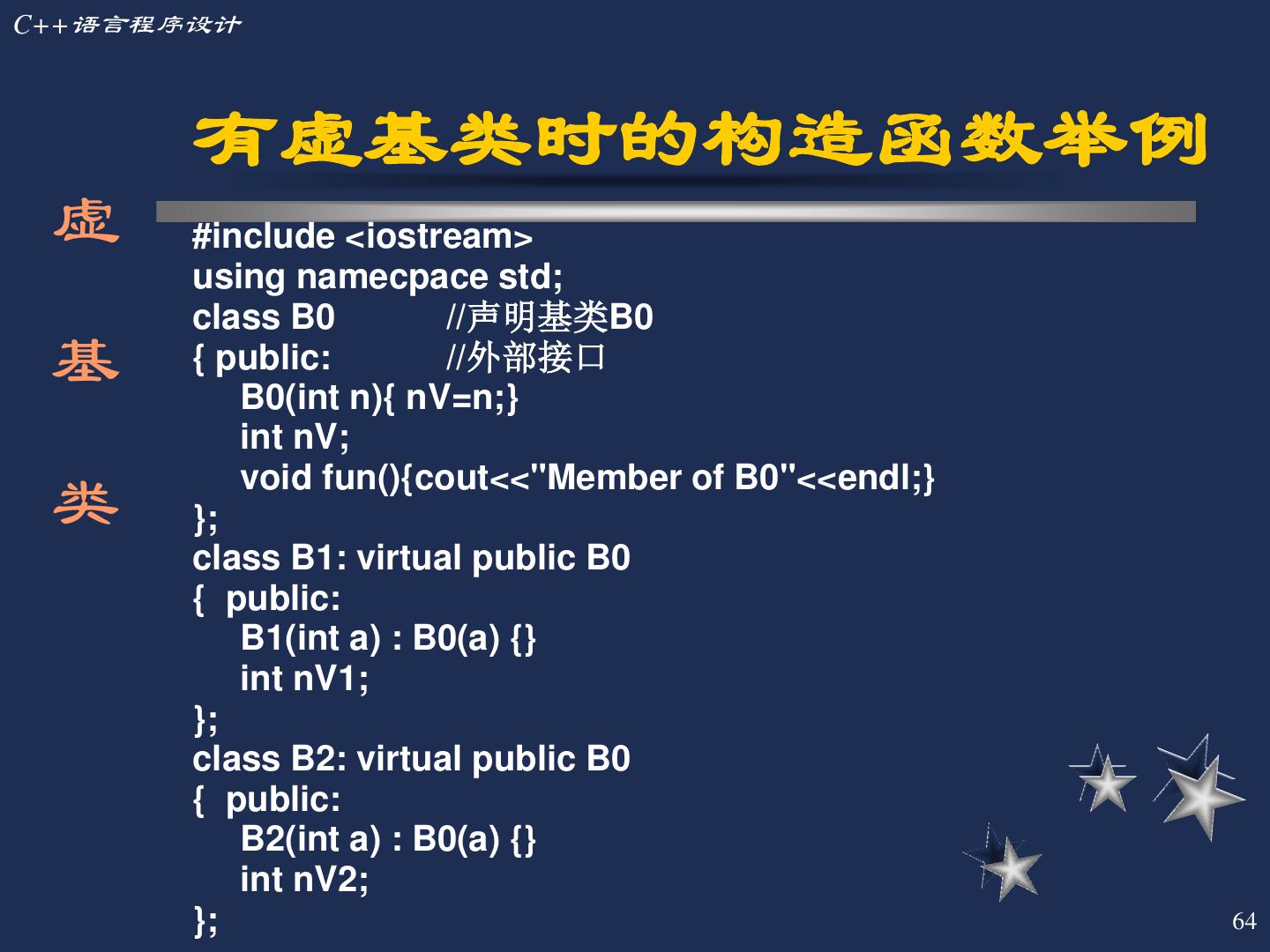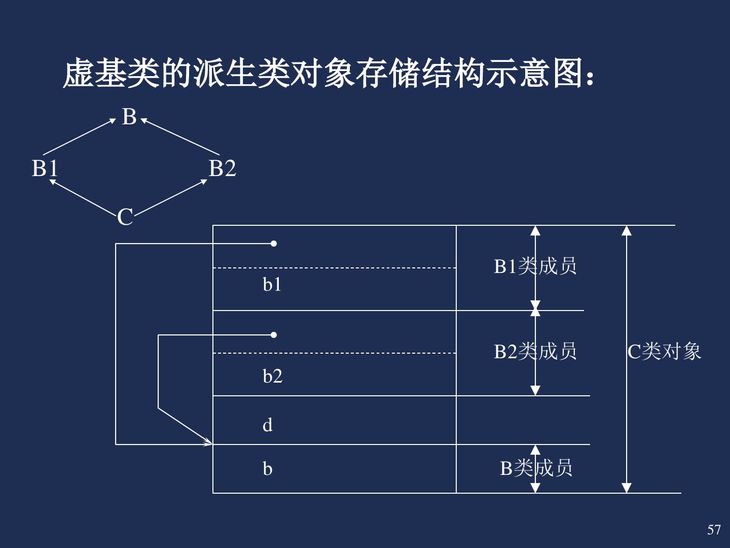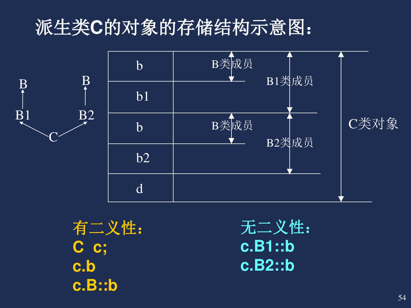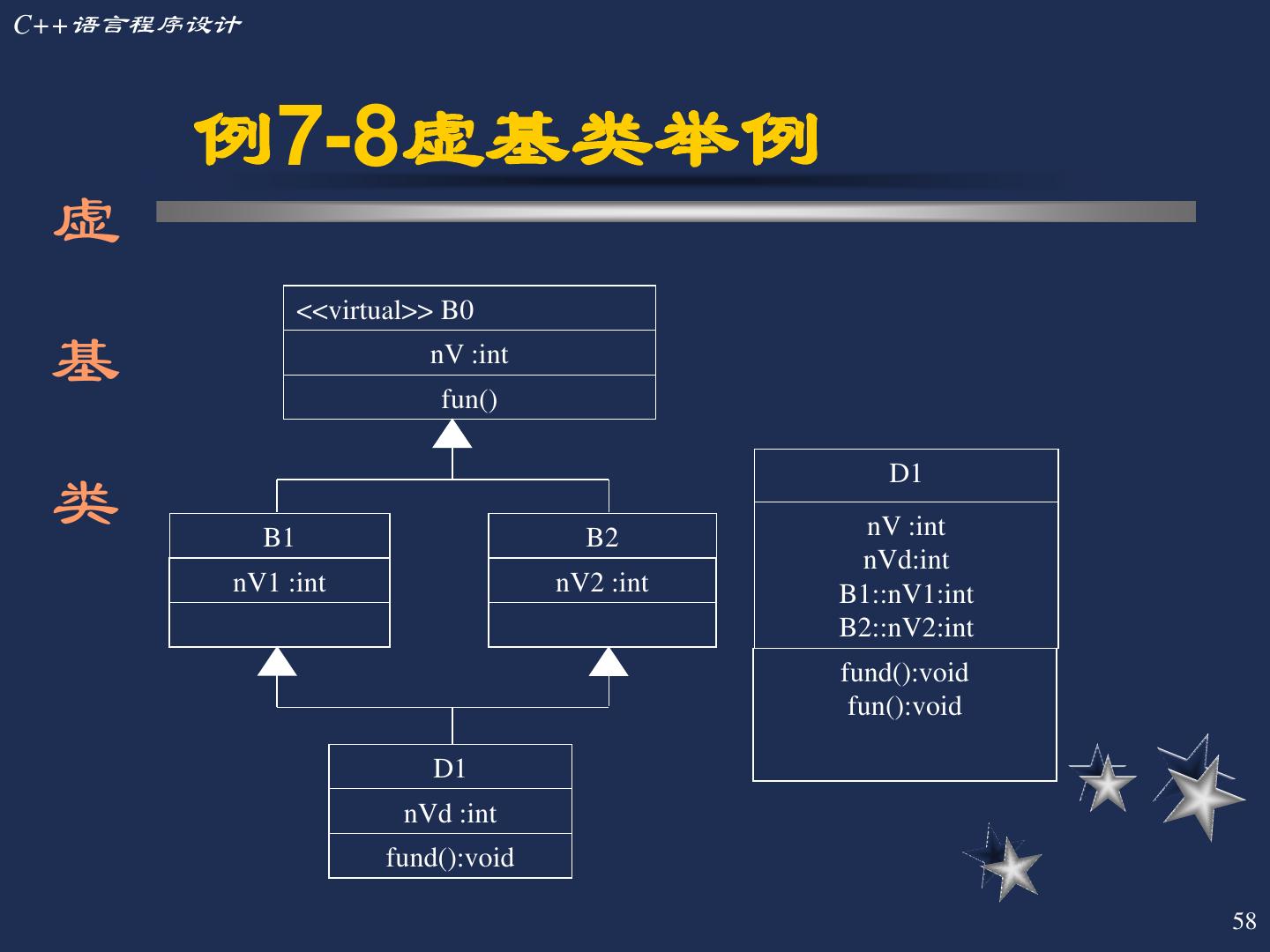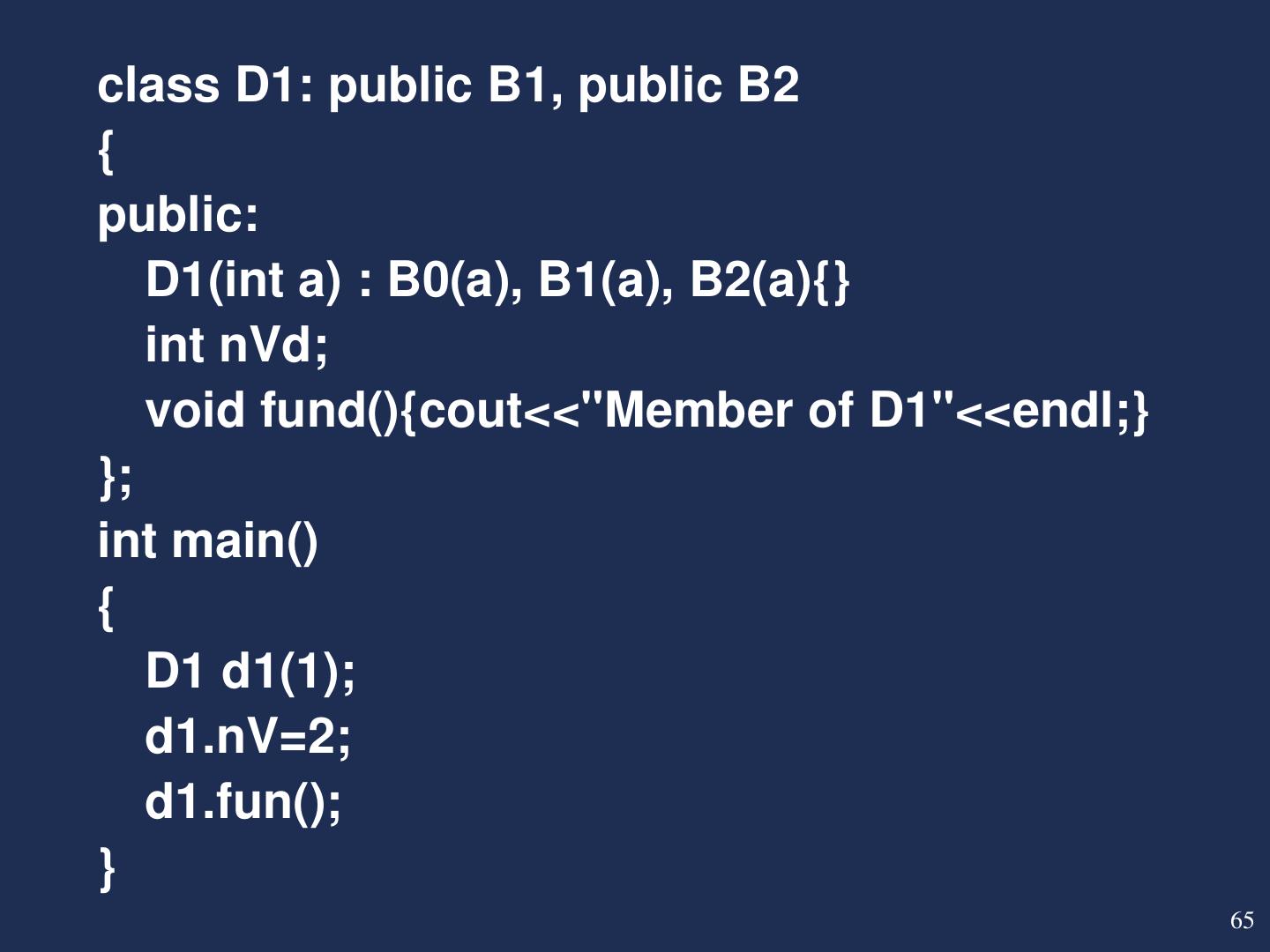 24 .class B1: public B0 { public: void display(){cout<<"B1::display()"<<endl;} }; class D1: public B1 { public: void display(){cout<<"D1::display()"<<endl;} }; void fun(B0 *ptr) { ptr->display();//"对象指针->成员名" } 24