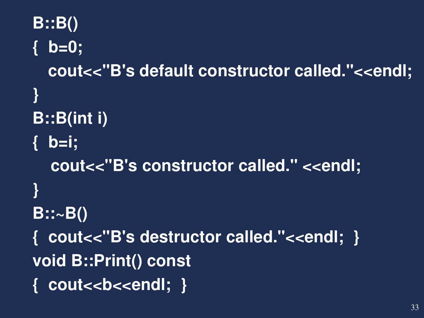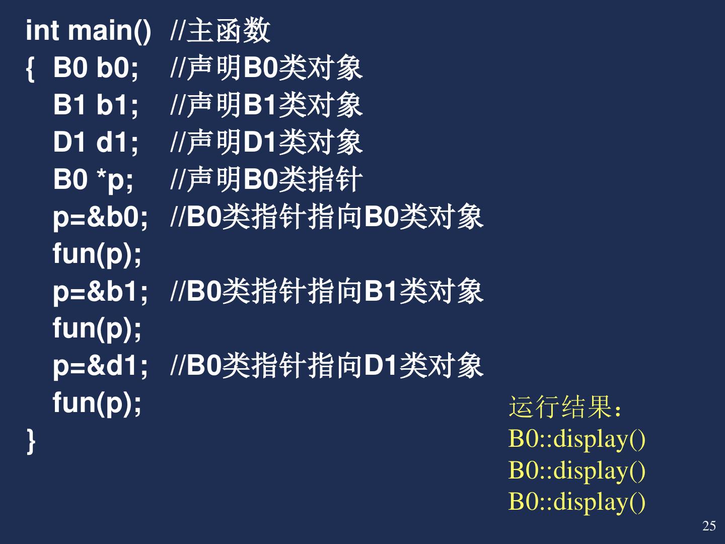 25 .int main() //主函数 { B0 b0; //声明B0类对象 B1 b1; //声明B1类对象 D1 d1; //声明D1类对象 B0 *p; //声明B0类指针 p=&b0; //B0类指针指向B0类对象 fun(p); p=&b1; //B0类指针指向B1类对象 fun(p); p=&d1; //B0类指针指向D1类对象 fun(p); 运行结果: } B0::display() B0::display() B0::display() 25