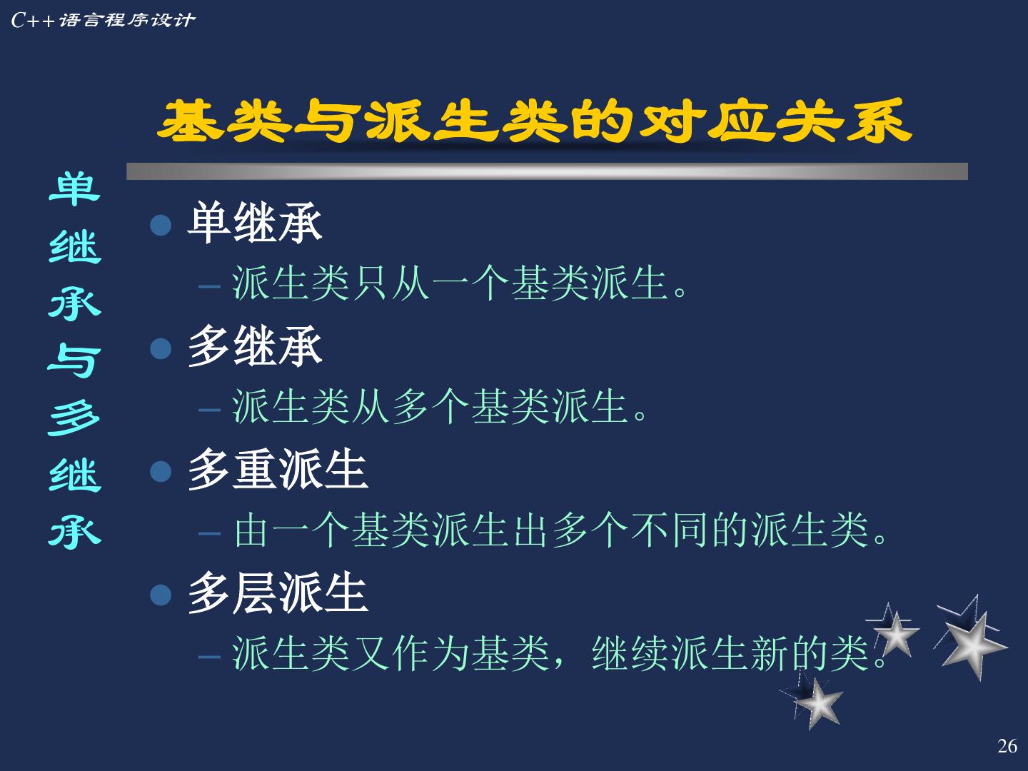26 .C++语言程序设计 基类与派生类的对应关系 单 单继承 继 – 派生类只从一个基类派生。 承 与 多继承 多 – 派生类从多个基类派生。 继 多重派生 承 – 由一个基类派生出多个不同的派生类。 多层派生 – 派生类又作为基类,继续派生新的类。 26