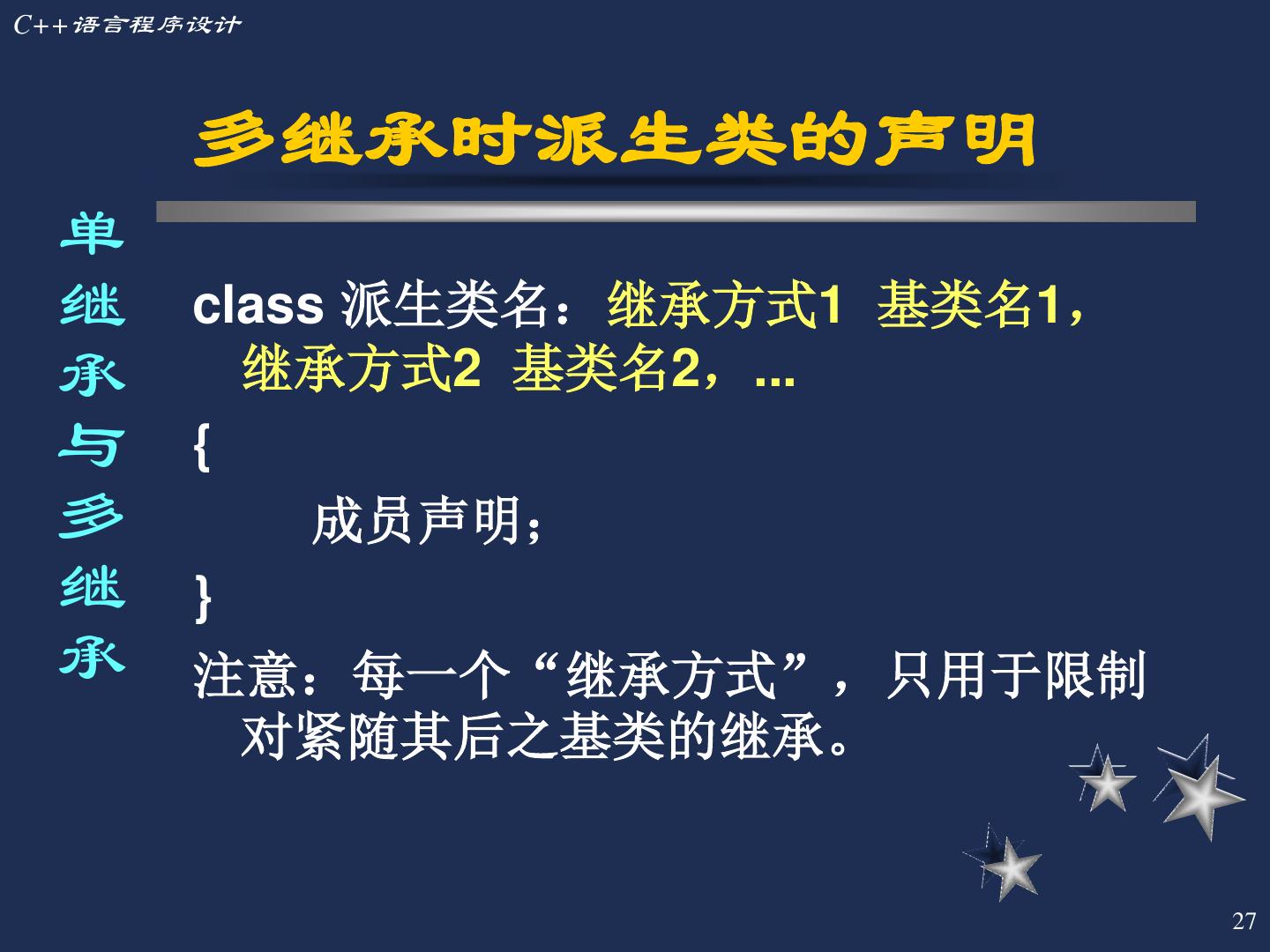27 .C++语言程序设计 多继承时派生类的声明 单 继 class 派生类名:继承方式1 基类名1, 承 继承方式2 基类名2,... 与 { 多 成员声明; 继 } 承 注意:每一个“继承方式”,只用于限制 对紧随其后之基类的继承。 27
