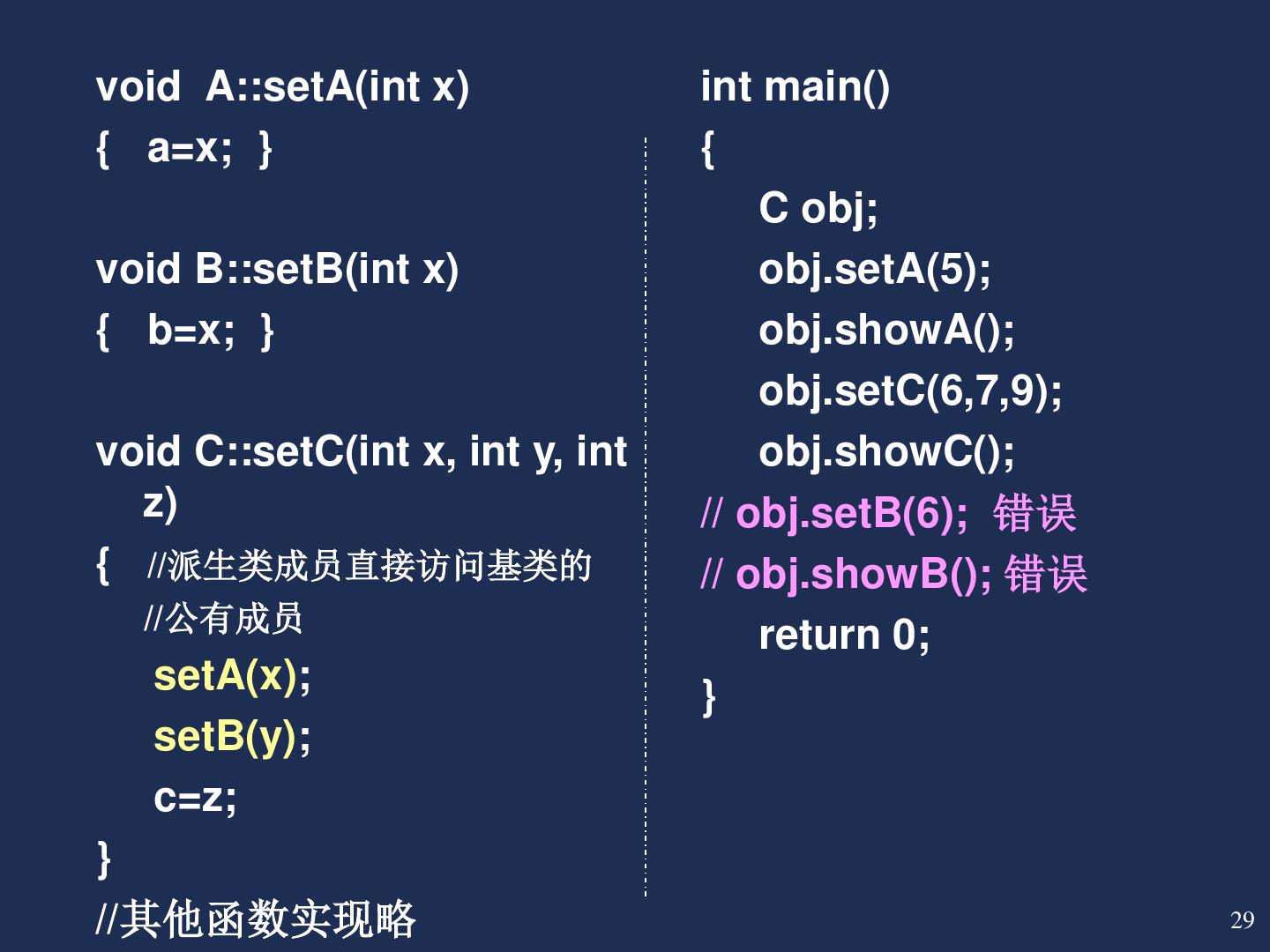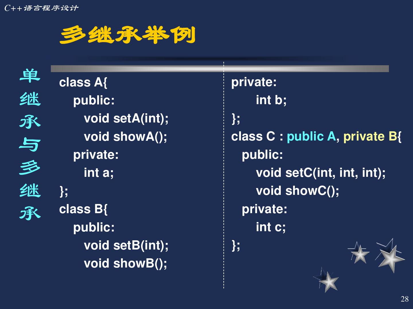 28 .C++语言程序设计 多继承举例 单 class A{ private: 继 public: int b; 承 void setA(int); }; class C : public A, private B{ void showA(); 与 private: public: 多 int a; void setC(int, int, int); 继 }; void showC(); 承 class B{ public: private: int c; void setB(int); }; void showB(); 28