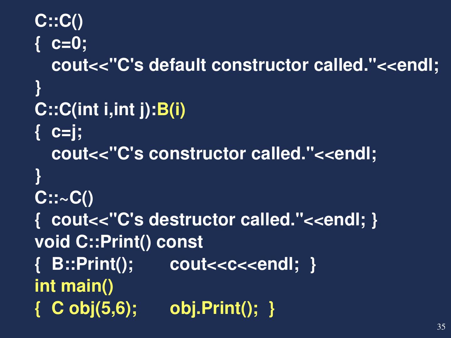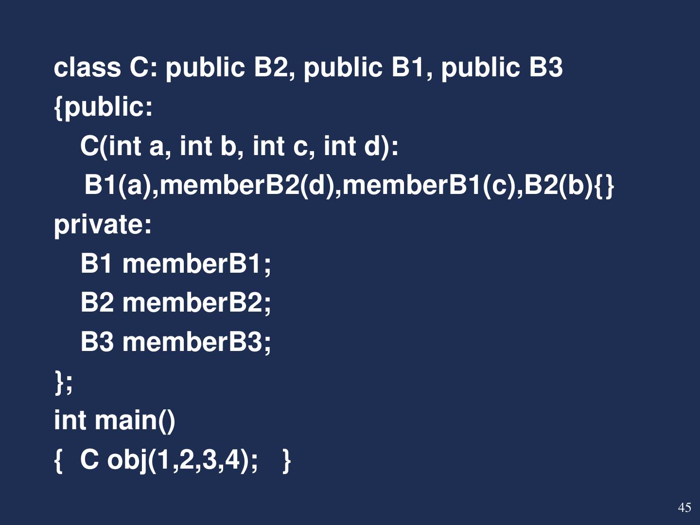 29 .void A::setA(int x) int main() { a=x; } { C obj; void B::setB(int x) obj.setA(5); { b=x; } obj.showA(); obj.setC(6,7,9); void C::setC(int x, int y, int obj.showC(); z) // obj.setB(6); 错误 { //派生类成员直接访问基类的 // obj.showB(); 错误 //公有成员 return 0; setA(x); } setB(y); c=z; } //其他函数实现略 29