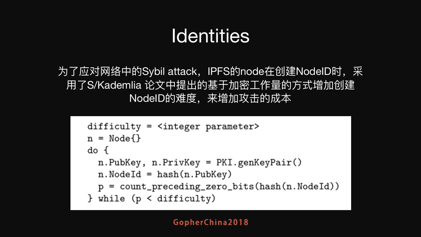 6 . Identities 为了了应对⽹网络中的Sybil attack,IPFS的node在创建NodeID时,采 ⽤用了了S/Kademlia 论⽂文中提出的基于加密⼯工作量量的⽅方式增加创建 NodeID的难度,来增加攻击的成本