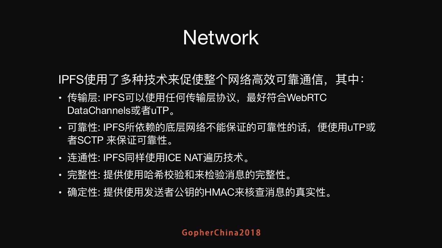 7 . Network IPFS使⽤用了了多种技术来促使整个⽹网络⾼高效可靠通信,其中: • 传输层: IPFS可以使⽤用任何传输层协议,最好符合WebRTC DataChannels或者uTP。 • 可靠性: IPFS所依赖的底层⽹网络不不能保证的可靠性的话,便便使⽤用uTP或 者SCTP 来保证可靠性。 • 连通性: IPFS同样使⽤用ICE NAT遍历技术。 • 完整性: 提供使⽤用哈希校验和来检验消息的完整性。 • 确定性: 提供使⽤用发送者公钥的HMAC来核查消息的真实性。