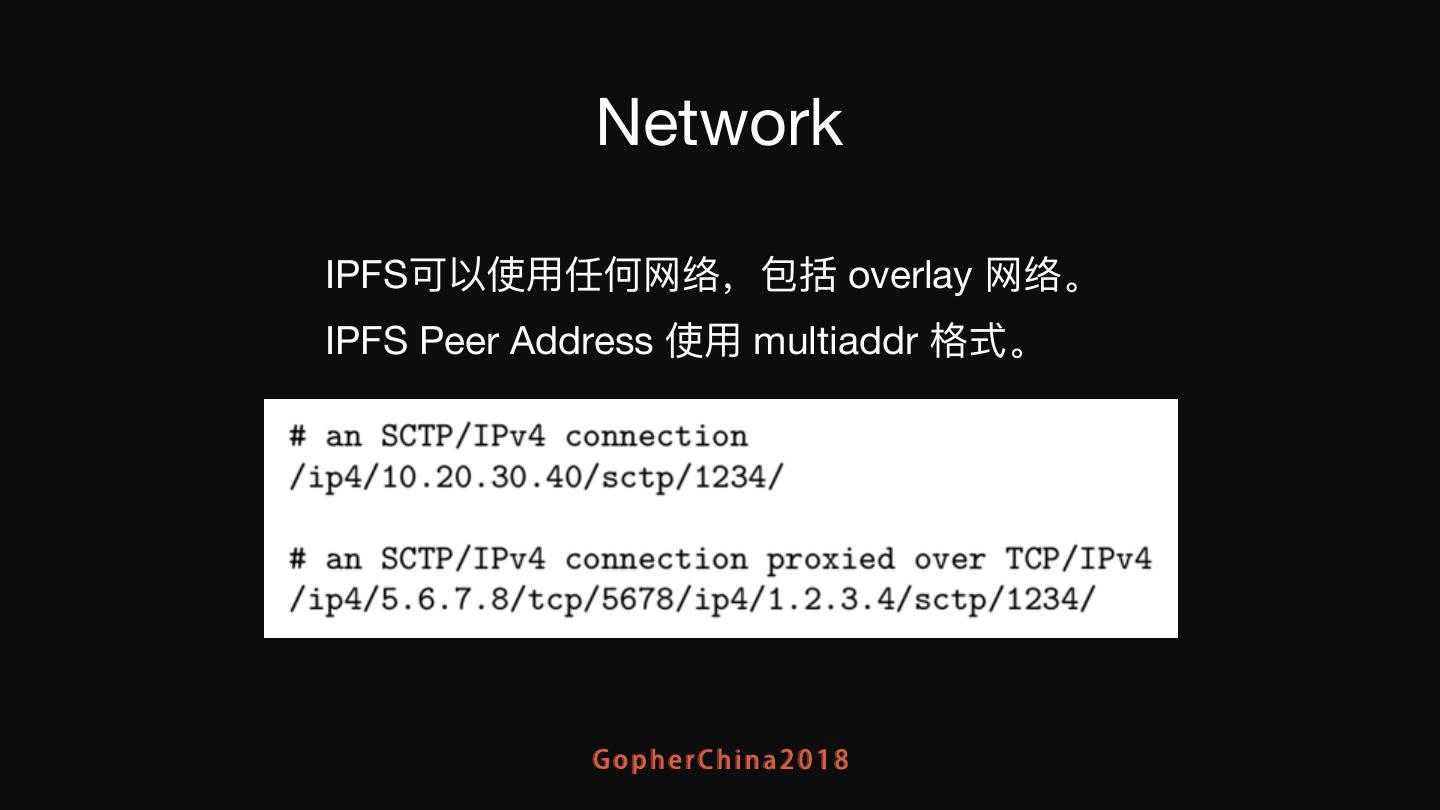 8 . Network IPFS可以使⽤用任何⽹网络,包括 overlay ⽹网络。 IPFS Peer Address 使⽤用 multiaddr 格式。