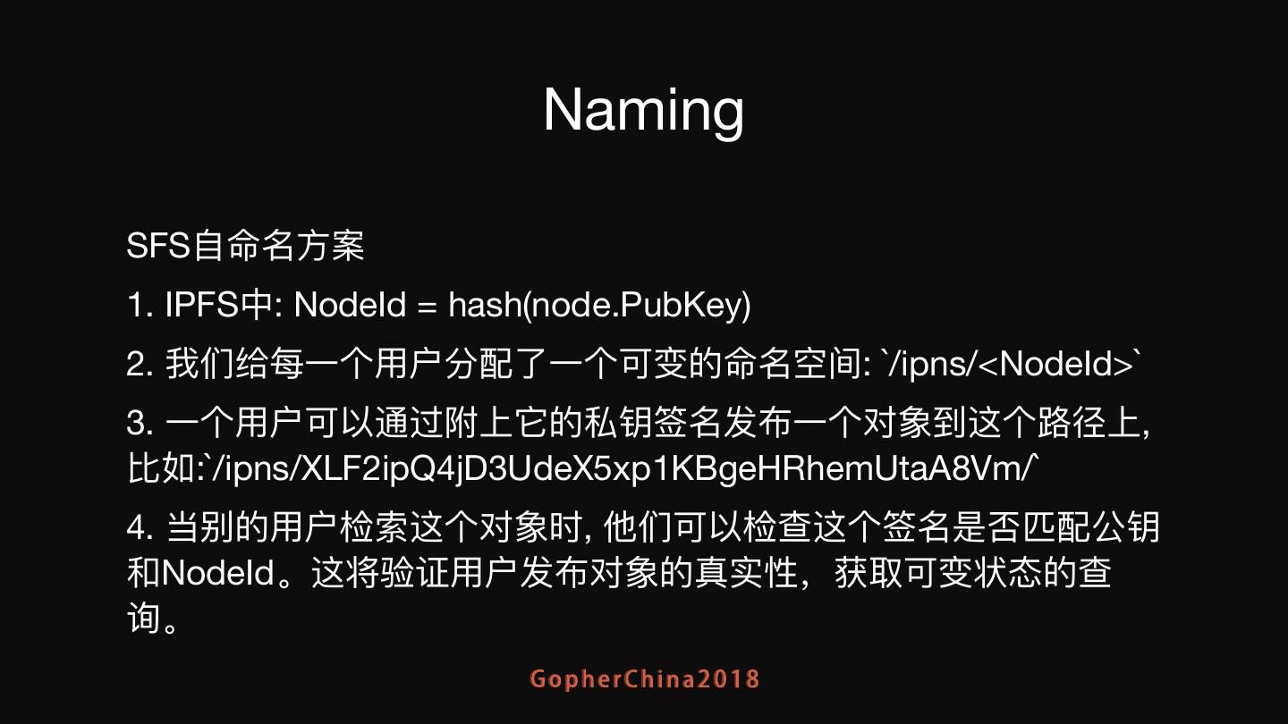 19 . Naming SFS⾃自命名⽅方案 1. IPFS中: NodeId = hash(node.PubKey) 2. 我们给每⼀一个⽤用户分配了了⼀一个可变的命名空间: `/ipns/<NodeId>` 3. ⼀一个⽤用户可以通过附上它的私钥签名发布⼀一个对象到这个路路径上, ⽐比如:`/ipns/XLF2ipQ4jD3UdeX5xp1KBgeHRhemUtaA8Vm/` 4. 当别的⽤用户检索这个对象时, 他们可以检查这个签名是否匹配公钥 和NodeId。这将验证⽤用户发布对象的真实性,获取可变状态的查 询。